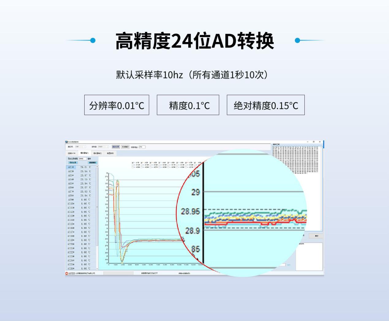 高精度24位AD转换默认采样率10hz(所有通道1秒10次),精度0.1℃,绝对精度0.15℃,分辨率0.01℃。