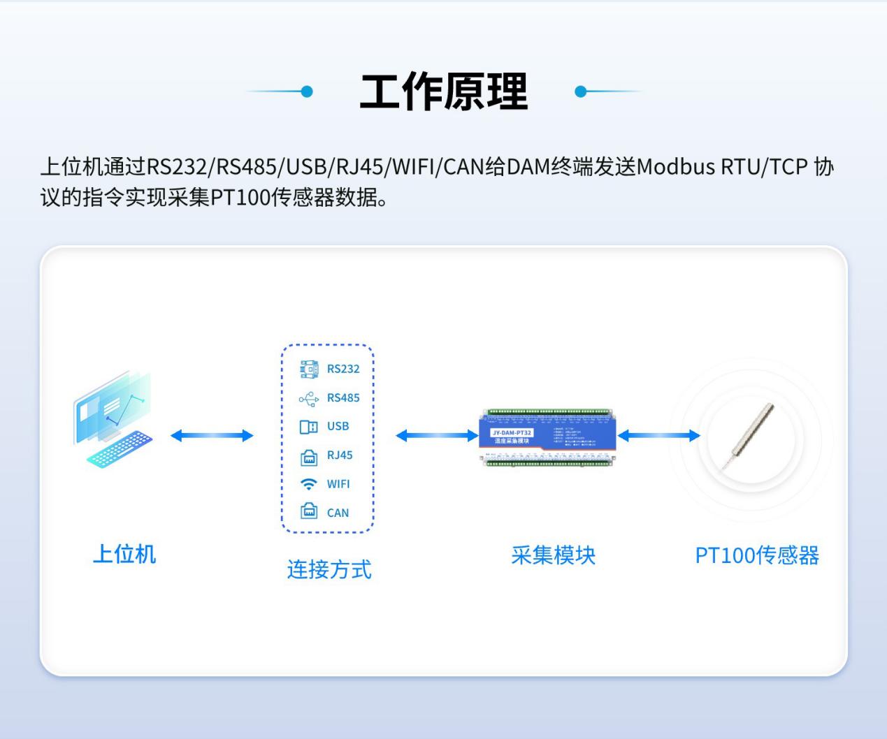 上位机通过RS232/RS485/USB/RJ45/WIFI/CAN给DAM终端发送ModbuSRTU/TCP协议的指令实现采集PT100传感器数据。