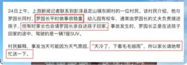 “幼儿园有校车,通常由罗园长的丈夫负责接送孩子,但有时家长也会请罗园长亲自送孩子回家。”上游新闻记者采访到的同村村民这样描述。他还记得,那天是“天冷了,下着毛毛细雨”,路上掉满了清淤的污泥。可能就是那个湿滑的瞬间,那辆载着孩子们的7座SUV失控了,冲向了那个据说很深、护栏形同虚设的池塘。