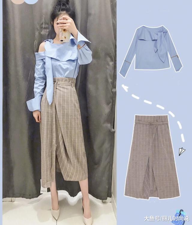 超显女人味的一套轻熟风穿搭,半露肩设计的衬衫,只露出一边的肩部,清凉又性感,一边的吊带设计很好展现出了轻熟风气息,满满高级感的有木有?搭配灰色格子半身裙,瞬间就提升了整体的时尚感,日常逛街或者是上班通勤都可以这么穿。