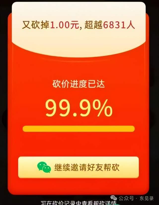 拼多多 2023 年数据显示,有超过 10 亿用户参与过砍一刀活动。 但真正拿到完整奖励的,不足 0.1%。 剩下的 99.9%,都成了免费流量和广告触达。