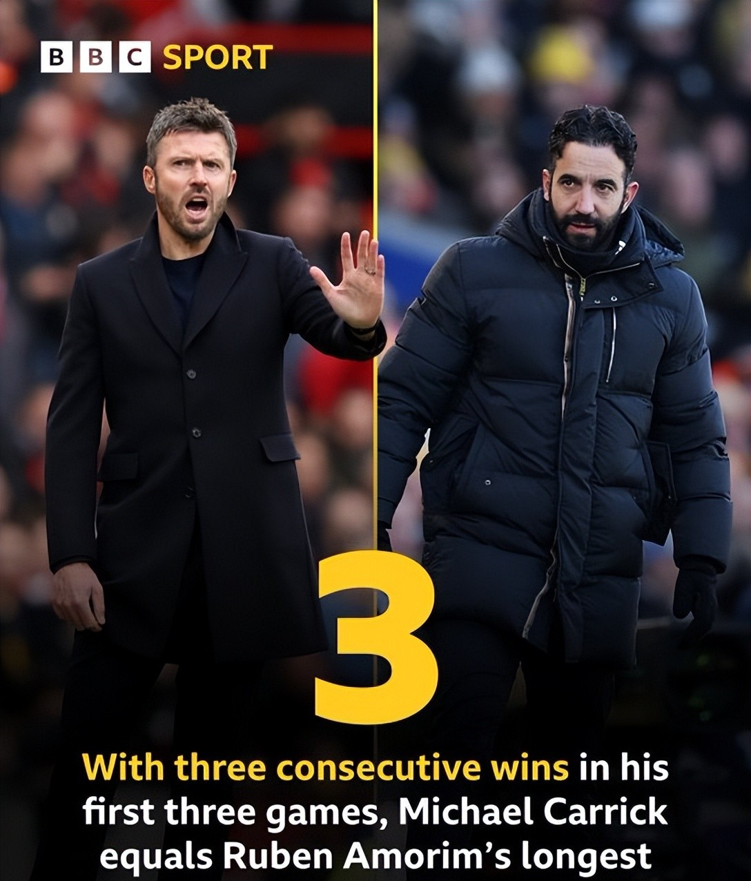 阿莫林执教曼联期间,用了47场比赛才迎来了首次正赛的3连胜。而卡里克,却仅仅用时3场就追平了阿莫林此前的成绩。
