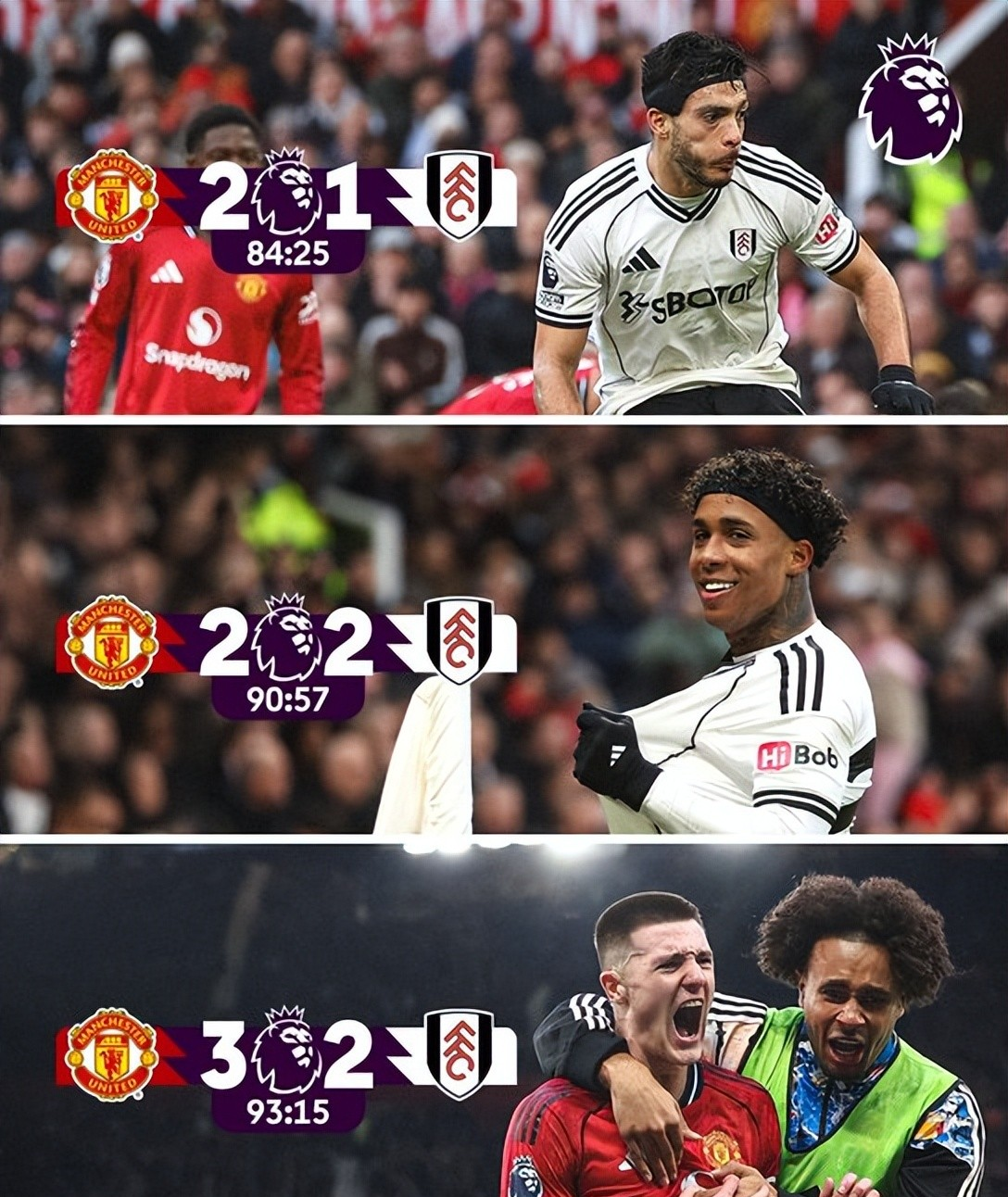所以,这就成为了一场在第84分钟之时都还是曼联2-0富勒姆、而全场都以为就会如此收场的对阵之时,会在第90+4分钟变成了包含绝杀好戏的最终3-2的险胜!
