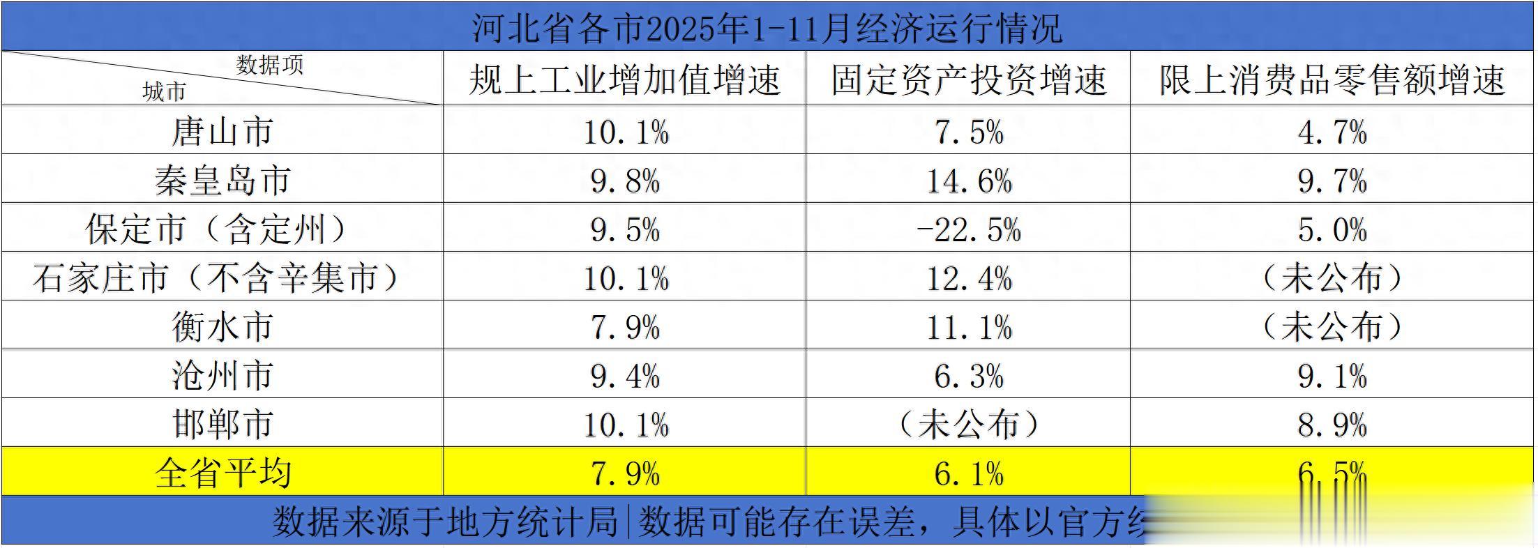 四、总结综合来看,2025年1-11月,河北省部分城市经济运行呈现“工业生产总体平稳、投资增长冷热不均、消费表现区域分化”的特点。多数城市在工业领域保持稳定增长,固定资产投资则在不同城市之间差距较大,消费增长亦呈现地域性差异。