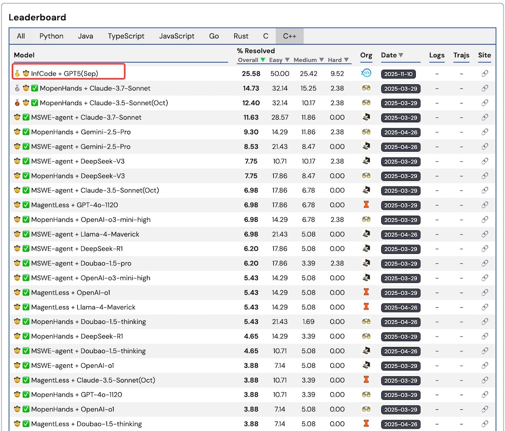 而在Multi-SWE-Bench-cpp这个工业级难度的榜单上,InfCode能把解决率做到25.58%,远超同类产品,秘诀就在团队专门研发的对抗式测试优化方案。