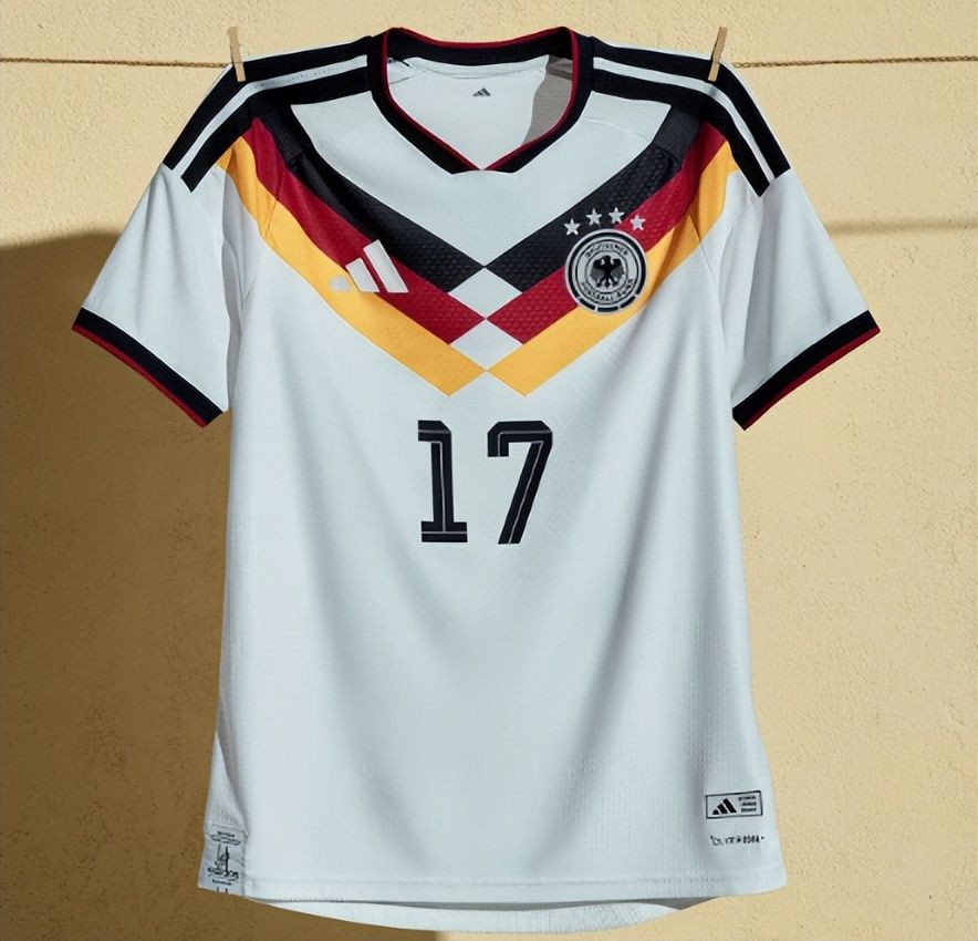 德国的球衣向来都是简略的白色底色,只是每一款上的德国国旗三色条纹设计会有一些变化。现在的这款似乎过于对称,显得有些呆板,没有以前的律动。