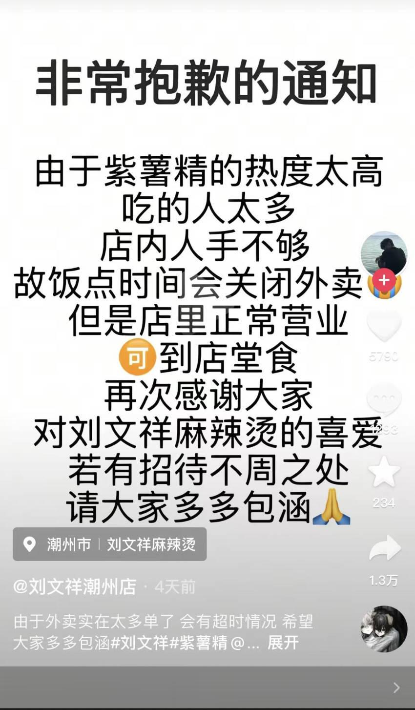 爆单的同时,不少刘文祥门店也迎来了经营压力。据网友反馈,刘文祥麻辣烫(弘阳店)在社交平台表示,爆单太严重,半个小时就不得不把外卖关了,出餐实在慢了很多。暂停外卖的还有刘文祥潮州店,该店在抖音平台称,因食客太多、人手不够,已在饭点暂停外卖服务,只能开放堂食。