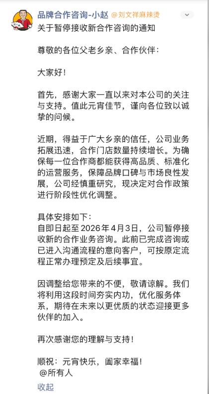 面对门店爆单、人手不足、供应链承压等一系列因流量爆火带来的难题,刘文祥麻辣烫官方品牌合作咨询账号近日发布了《关于暂停接收新合作咨询的通知》,明确自3月2日起至4月3日,公司暂停接收新的合作业务咨询。此前已完成咨询或已进入沟通流程的意向客户,则可按原定流程正常办理预定及后续事宜。官方表示,此举是为了集中精力保障现有门店的服务质量、维护品牌口碑。
