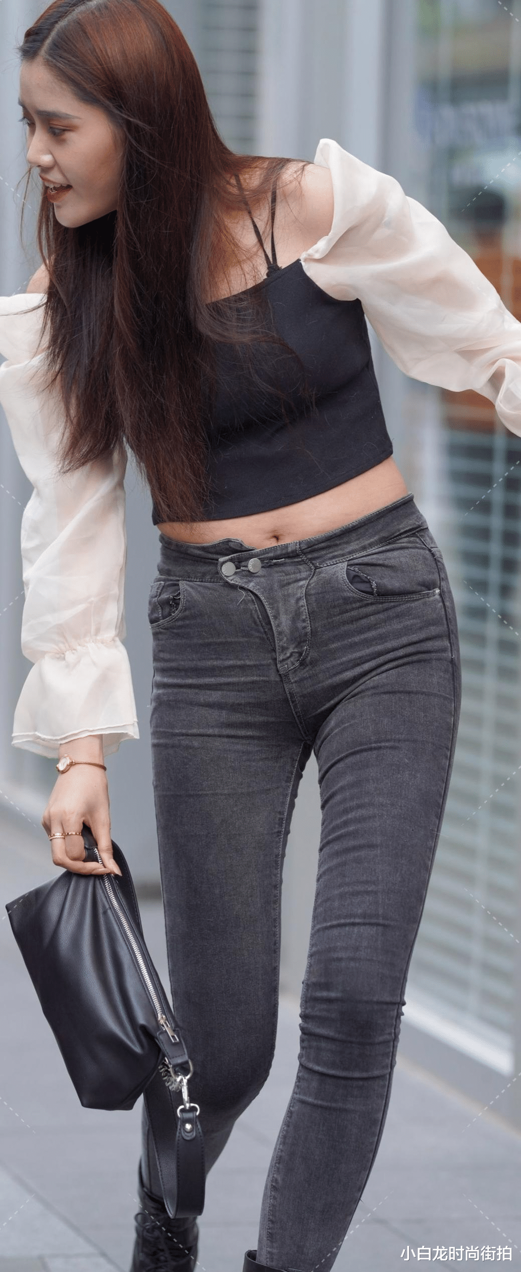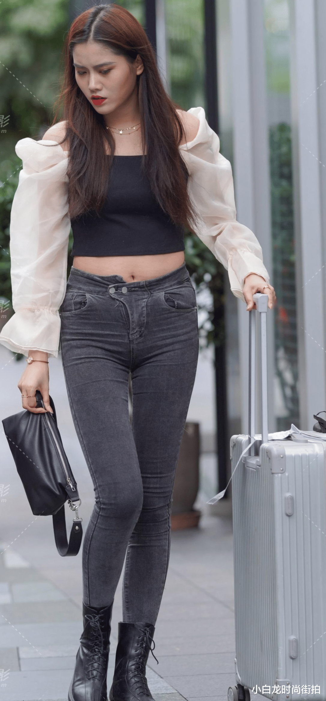 秋风穿街而过,掀起一袭米白轻纱——蓬松的灯笼袖在光影中起伏,黑色吊带若隐若现地勾勒出肩颈线条,灰色牛仔裤裹着修长双腿,马丁靴敲击地面的节奏清脆笃定。这是属于早秋的惊鸿一瞥,也是甜酷风格最精准的视觉表达。