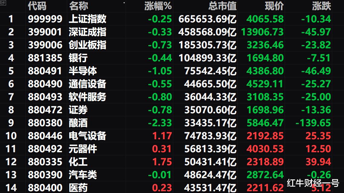 三、今天拖累大盘走势的大市值板块依然是半导体、通信设备、软件等科技板块,另外银行板块也走低了,本年银行板块跌幅达到了6.98%,银行板块之前已连涨三年,我估计今年银行板块将是大跌的走势,没有只涨不跌的。