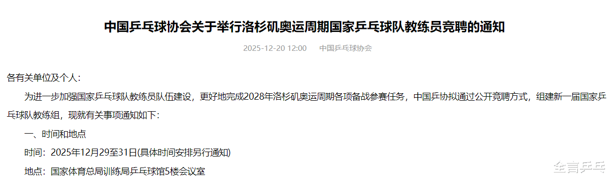 2025年12月20日,国乒传来重要消息,那就是教练组即将迎来重大变动,月底(12月29日~31日)将举行公开竞聘,确定新任总教练、男女队主教练以及恢复设立的副总教练等职位归属,李隼等人是否卸任引发球迷热议,更多详情请看下文。