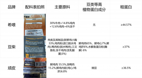 豆柴猫粮:粗蛋白≥37%、粗脂肪≥16%,牛磺酸≥0.2%,官方公示胃蛋白酶消化率92.3%、粗蛋白表观消化率85.87%。原料中动物源性成分包含新鲜鸡小胸(33%)、多种肉粉及冻干鸡肉。配料中含有马铃薯粉、红薯粉、小米等植物性成分,植物蛋白会占据一定比例。