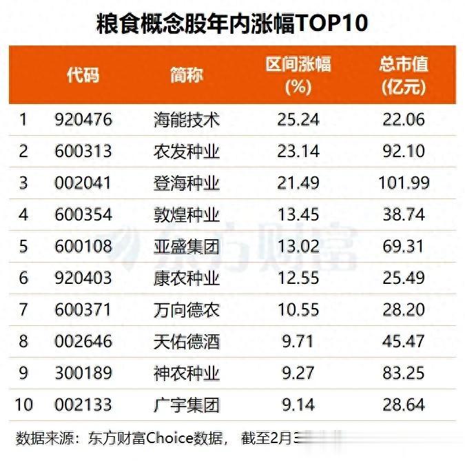 数据显示,A股33只粮食概念股合计总市值超2500亿元,今年以来多数实现股价上涨。