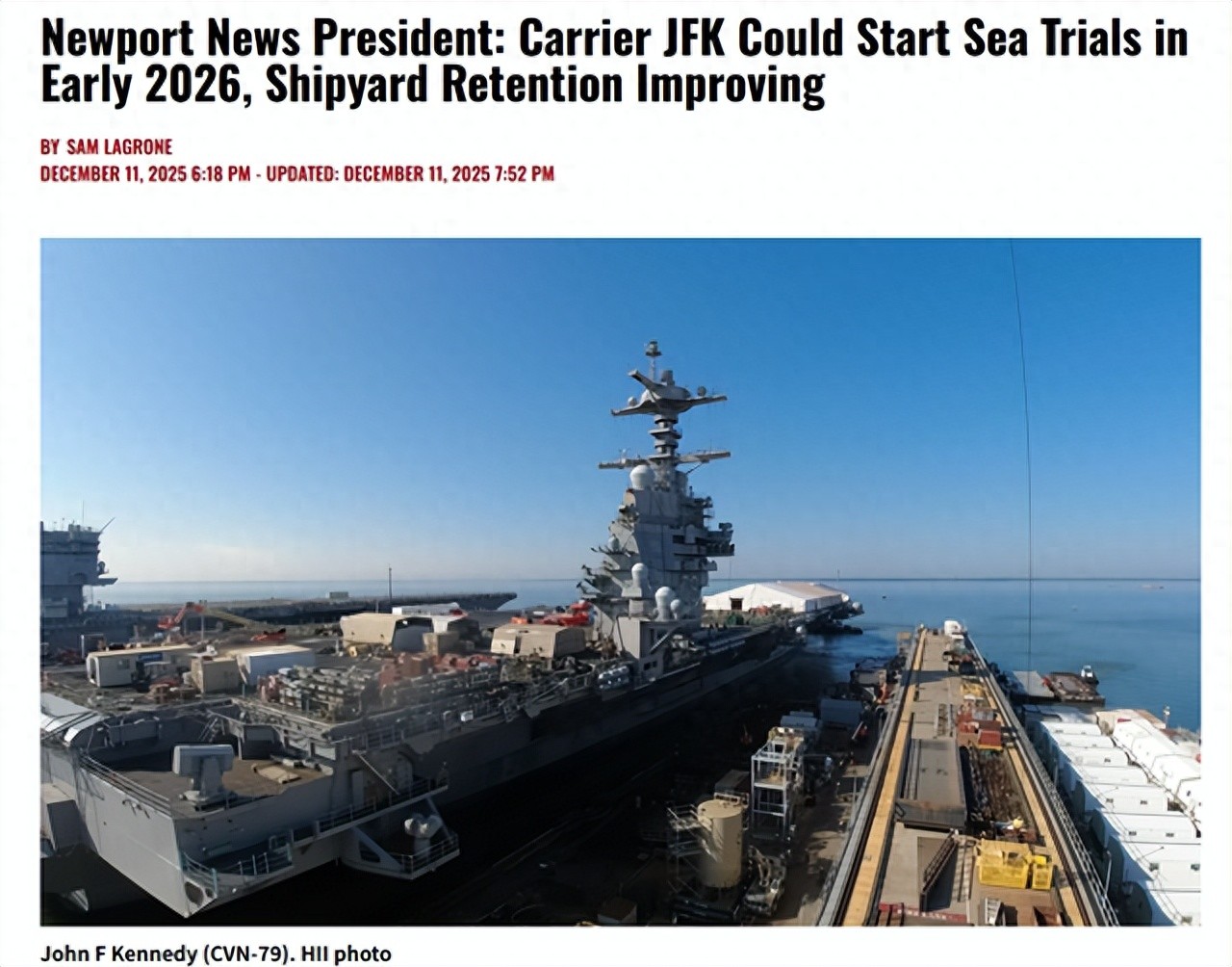 《海军协会新闻》称,纽波特纽斯造船厂总裁卡丽·威尔金森表示,“(肯尼迪号航母)舰上部队正在严格训练,确保他们做好了作战准备,我预计该舰将在年初启航进行首次海试。”,且“肯尼迪号计划在年中进行初步验收,目前正等待该船的最终认证。”
