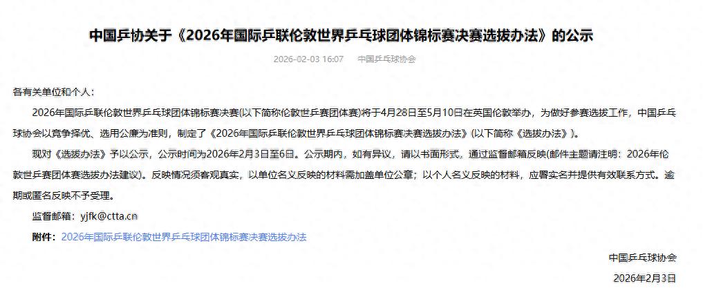 2月3日,中国乒协官网公布了《2026年国际乒联伦敦世界乒乓球团体锦标赛决赛选拔办法》。