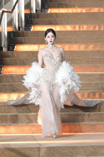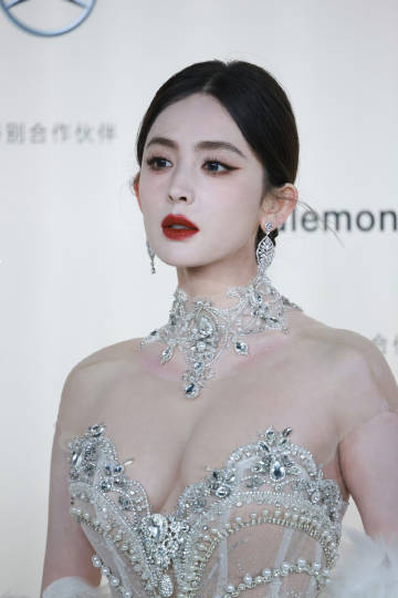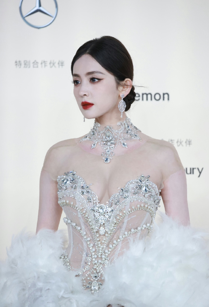 妆容精致,红唇如火,与礼服的银白形成鲜明对比,更添几分妩媚与霸气。她的眼神坚定而自信,仿佛在向世界宣告:这就是我的舞台,我是这里的女王!