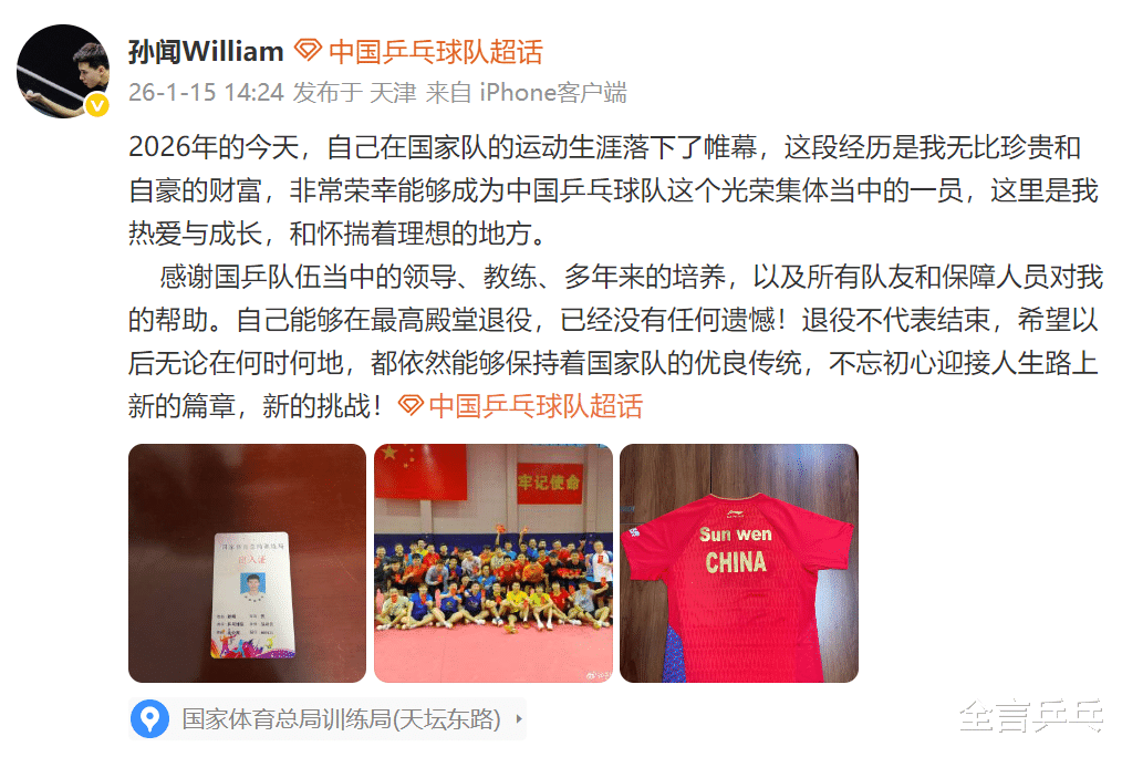 这是2026年1月15日,中国乒乓球运动员孙闻宣布离开国家队时在网上的留言——作为一位与大满贯樊振东同龄的选手,孙闻曾经在张本智和对国乒威胁最大的时候一战成名,以世界排名599位选手的身份4-0横扫对方,收获教练组的重视,但最终未能把握住机会上位成为主力,如今他的职业生涯也是无数中国乒坛选手的一个缩影,令人感慨不已。