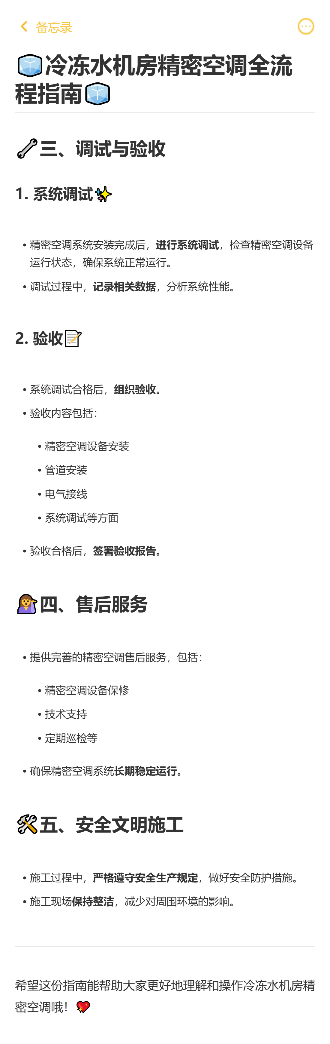 总结:冷冻水精密空调,调试验收守好“质量关”,售后服务握好“保障关”,安全施工筑牢“安全关”,三大环节做到位,后期运维更省心、更放心!