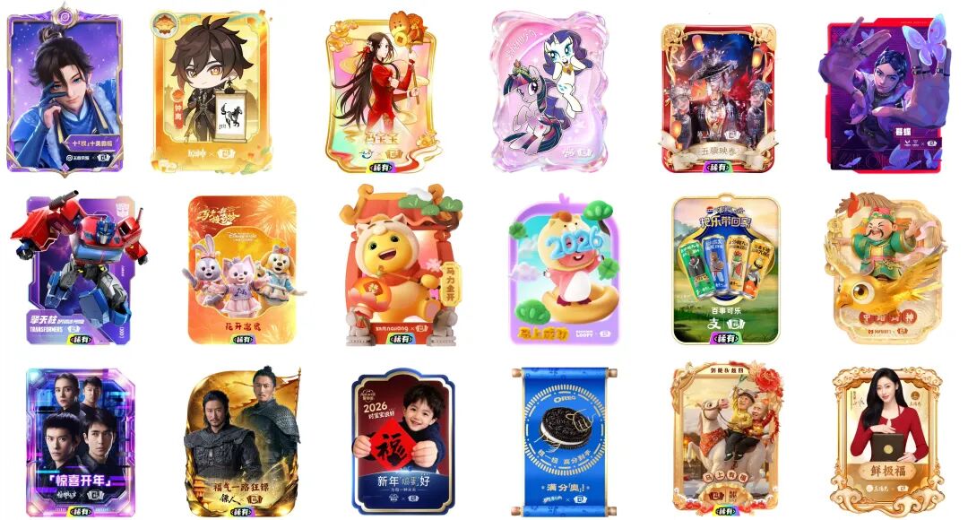 在支付宝,过年轻人的赛博新年今年已经是支付宝集福活动的第十一个年头,从2016年的全网寻找“敬业福”,到后来的“万能福卡”“全家福卡”,到2024年升级为“五福节”,再到2026年联合18大IP齐发福。如今,集福已经从支付宝的一个品牌活动,成为刻在用户DNA里的“赛博新年俗”。