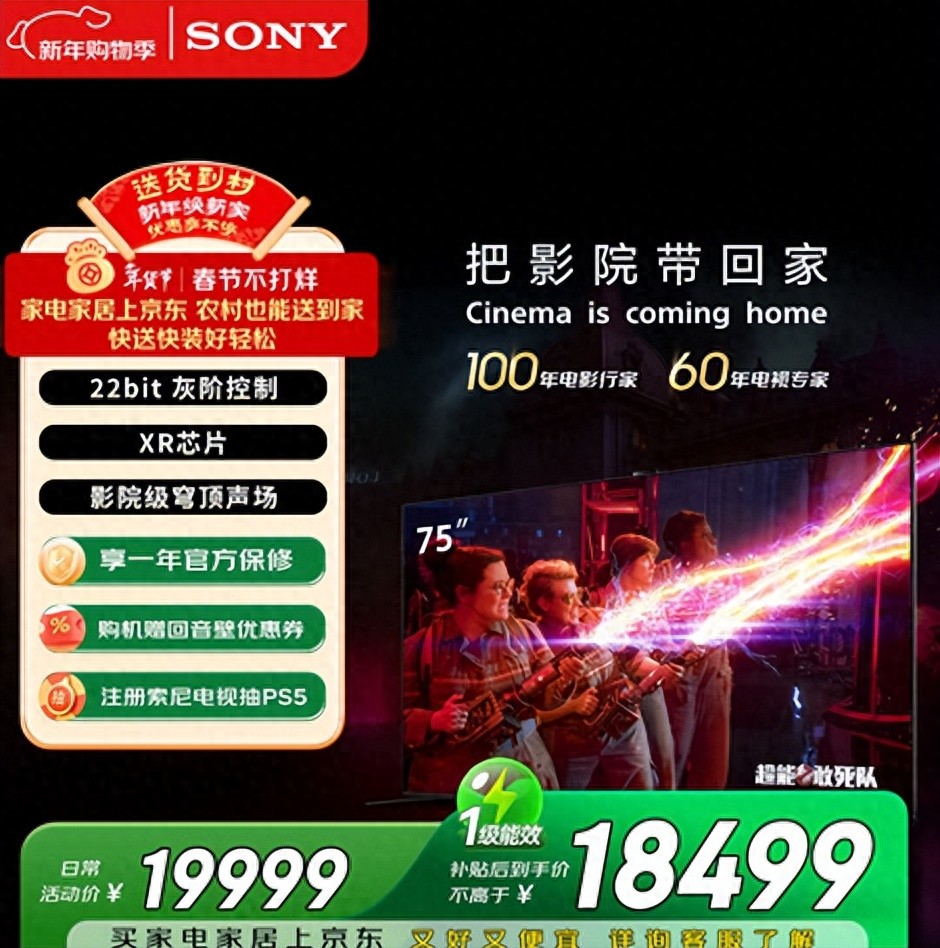 75吋索尼XR90,采用QD-Mini LED技术,搭配索尼XR认知芯片的专属调校,延续品牌一脉相承的旗舰画质底蕴。屏幕搭载X-抗反射工艺,配合X-广锐视角技术,新春阖家观影时,无论居于主位还是侧角,皆能收获无偏色、无畸变的纯正画面,全视角体验始终高端如一。