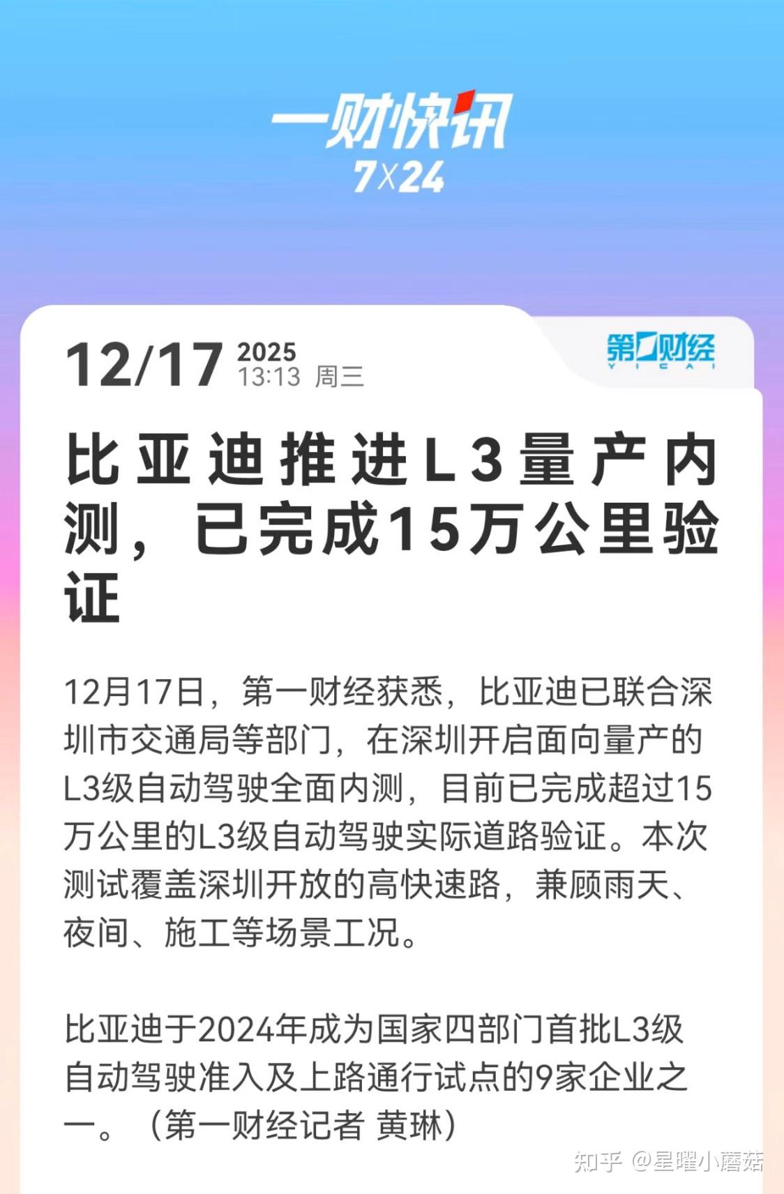 真是闷声干大事,比亚迪其实早在2023年就获得了国内第一张L3级自动驾驶测试牌照,2024年成为了国家四部门首批L3级自动驾驶准入和上路通行试点的9家企业之一!