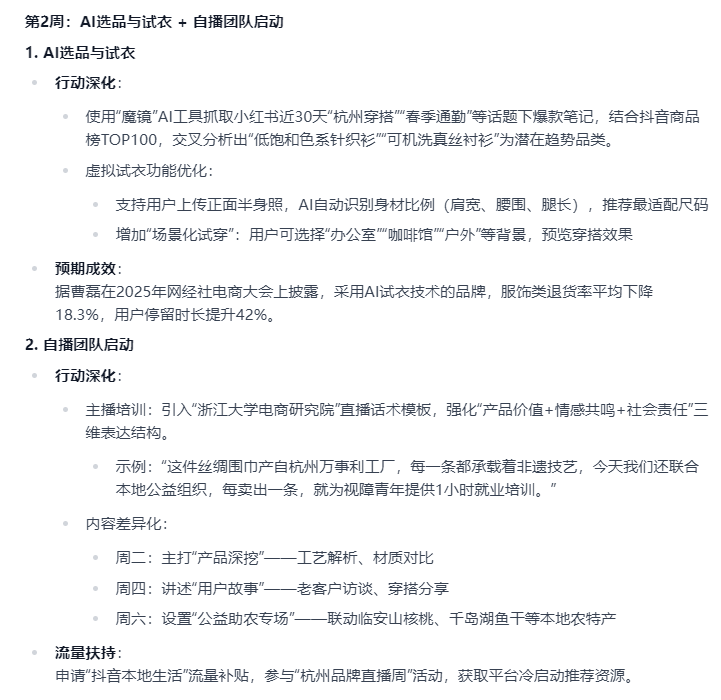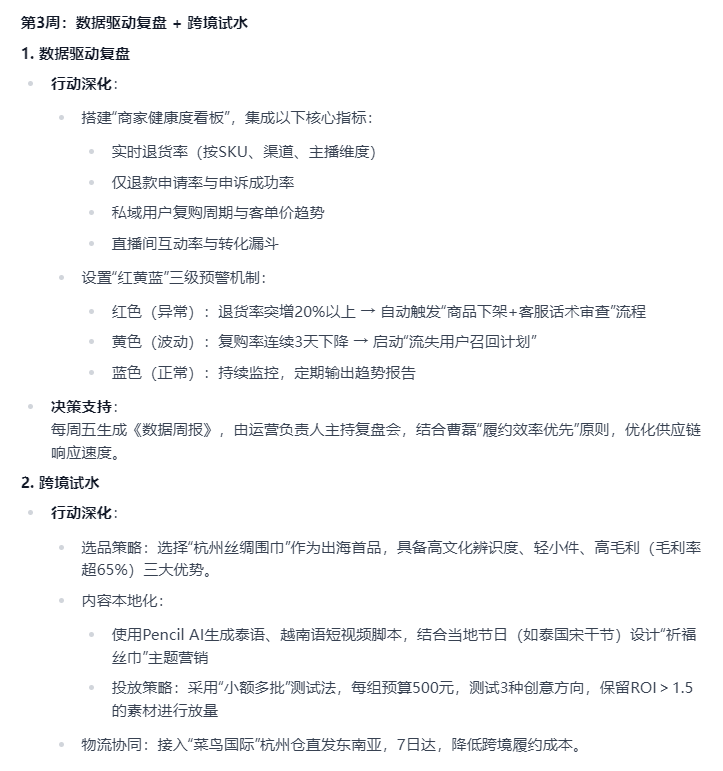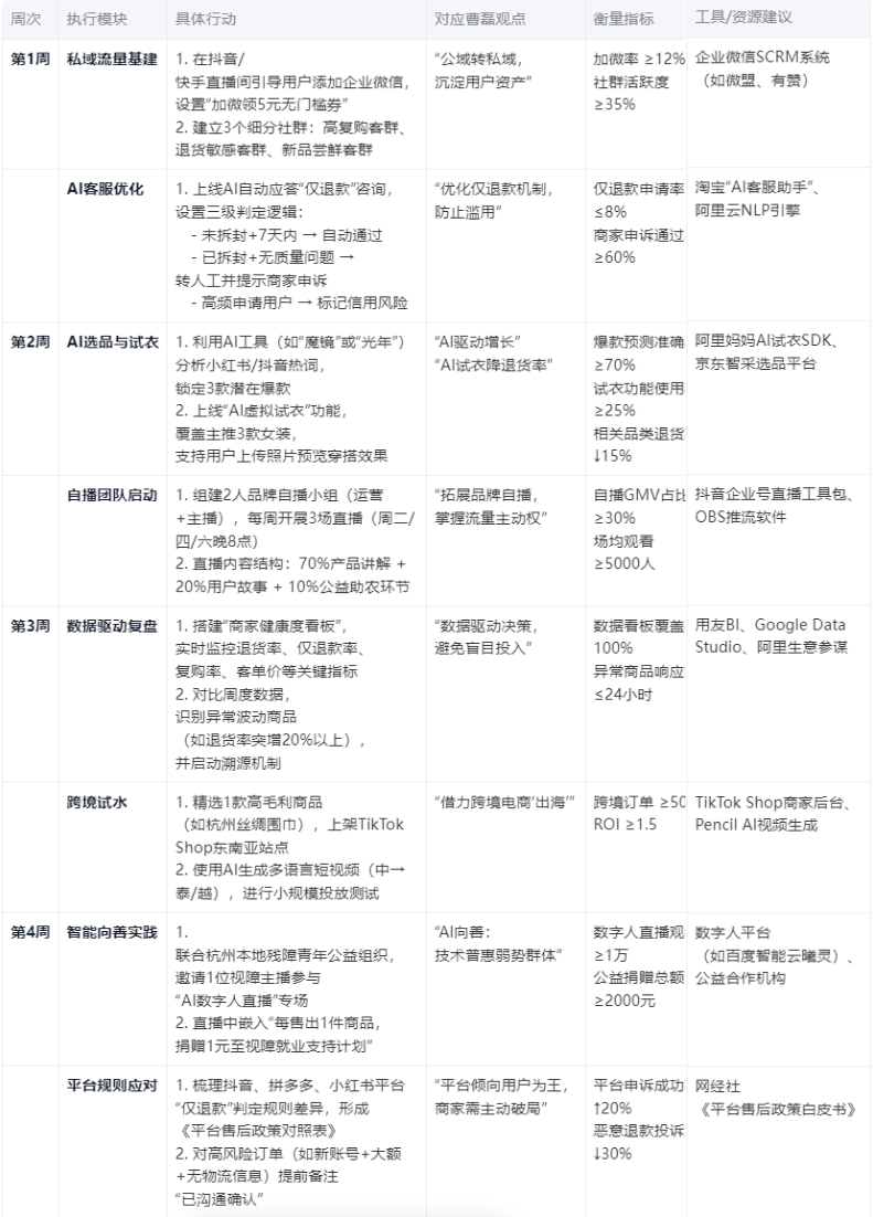 此外,基于其曹磊的核心观点,结合浙江杭州区域电商生态特点(直播产业发达、供应链成熟、AI应用活跃),拆解为可执行、可追踪、可复盘的30天行动路径。