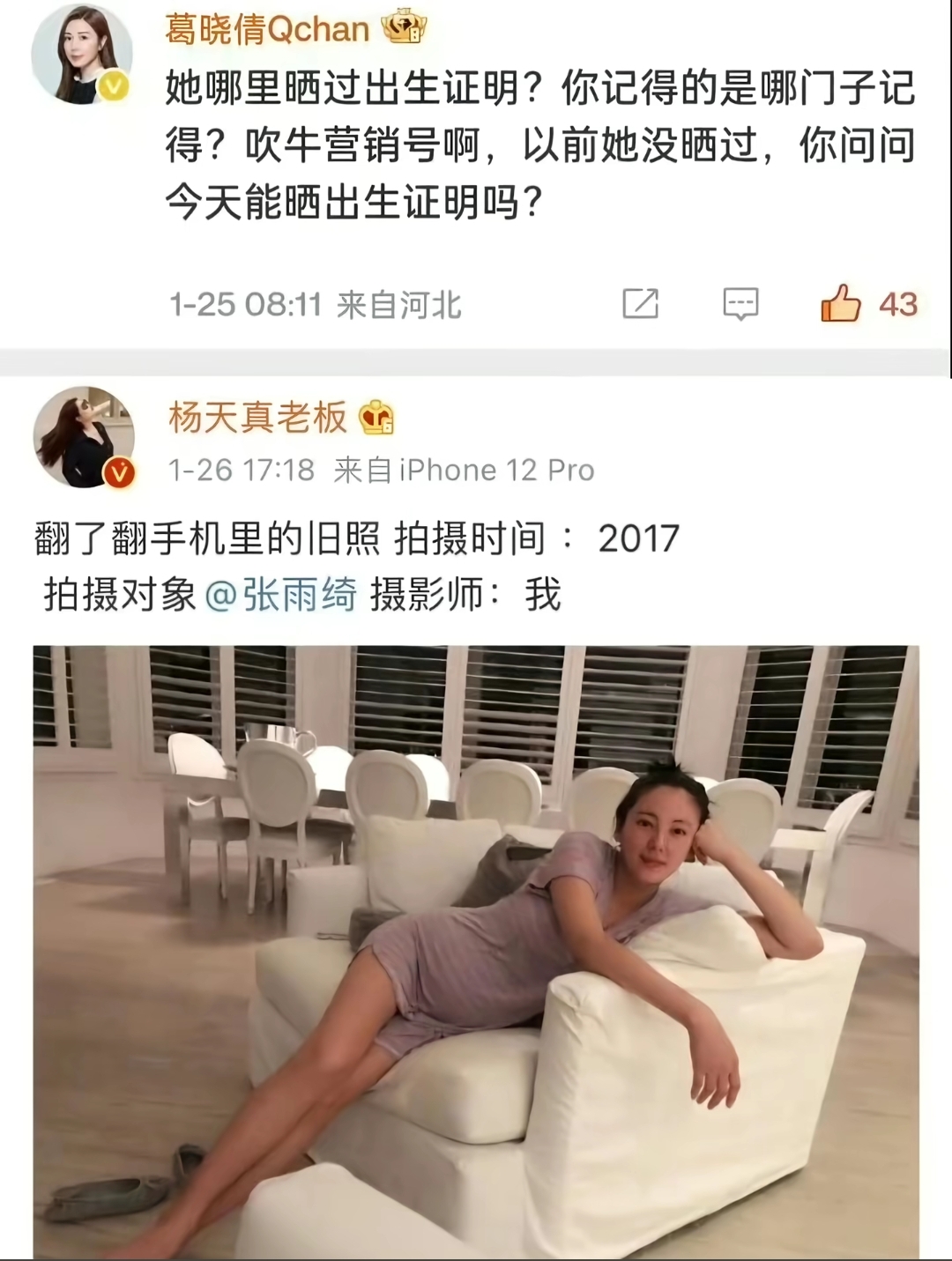 杨天真在1月26日,在某博上还发布了拍张雨绮孕肚的照片动态,很明显就是在给张雨绮辟谣。
