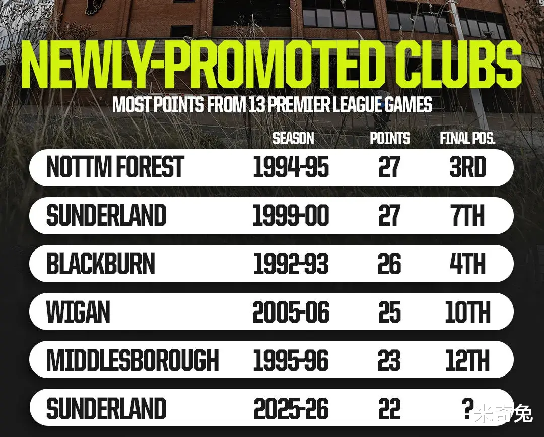 从统计数据可以看到,桑德兰是最近20年来在英超成绩最好的升班马球队。上一支如此惊艳的升班马,还是2005-06赛季的维甘竞技。