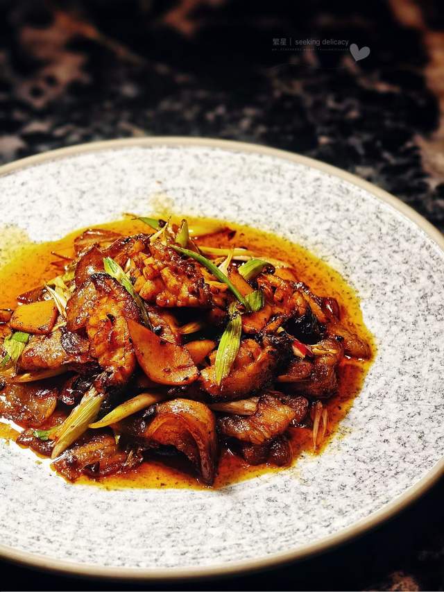 “蒜泥白肉”以复制酱油与秘制红油勾勒咸甜醇厚;“临江鳝鱼”通过双椒与藿香叠加出层次分明的麻辣;“回锅双鲍”以传统“煵”制手法融合鲍鱼与杏鲍菇的鲜香;而“鱼香肉丝春卷”、“川味菜肉馄饨”等创意菜,则展现了主理人对川味符号的灵动解构。每一道菜皆在章法自然中,传递出川菜不止于麻辣的丰富面貌。