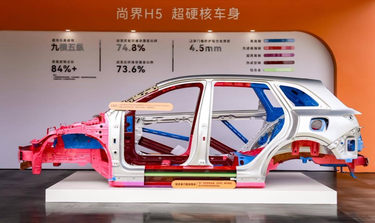 在C-NCAP的严苛测试中,尚界H5在乘员保护项目中得分率高达98.27%,几乎接近满分。这一成绩背后,是其在车身结构与材料选择上的极致追求。整车高强度钢占比达到84%,其中25%为强度高达1500MPa的热成型钢,这一材料通常应用于核潜艇或航空航天领域。前乘员舱核心骨架更是实现100%热成型钢覆盖,配合覆盖率达74.8%的超宽双前防撞梁,以及四门热成型钢防撞梁,共同构建出一个坚固可靠的笼式车身结构。