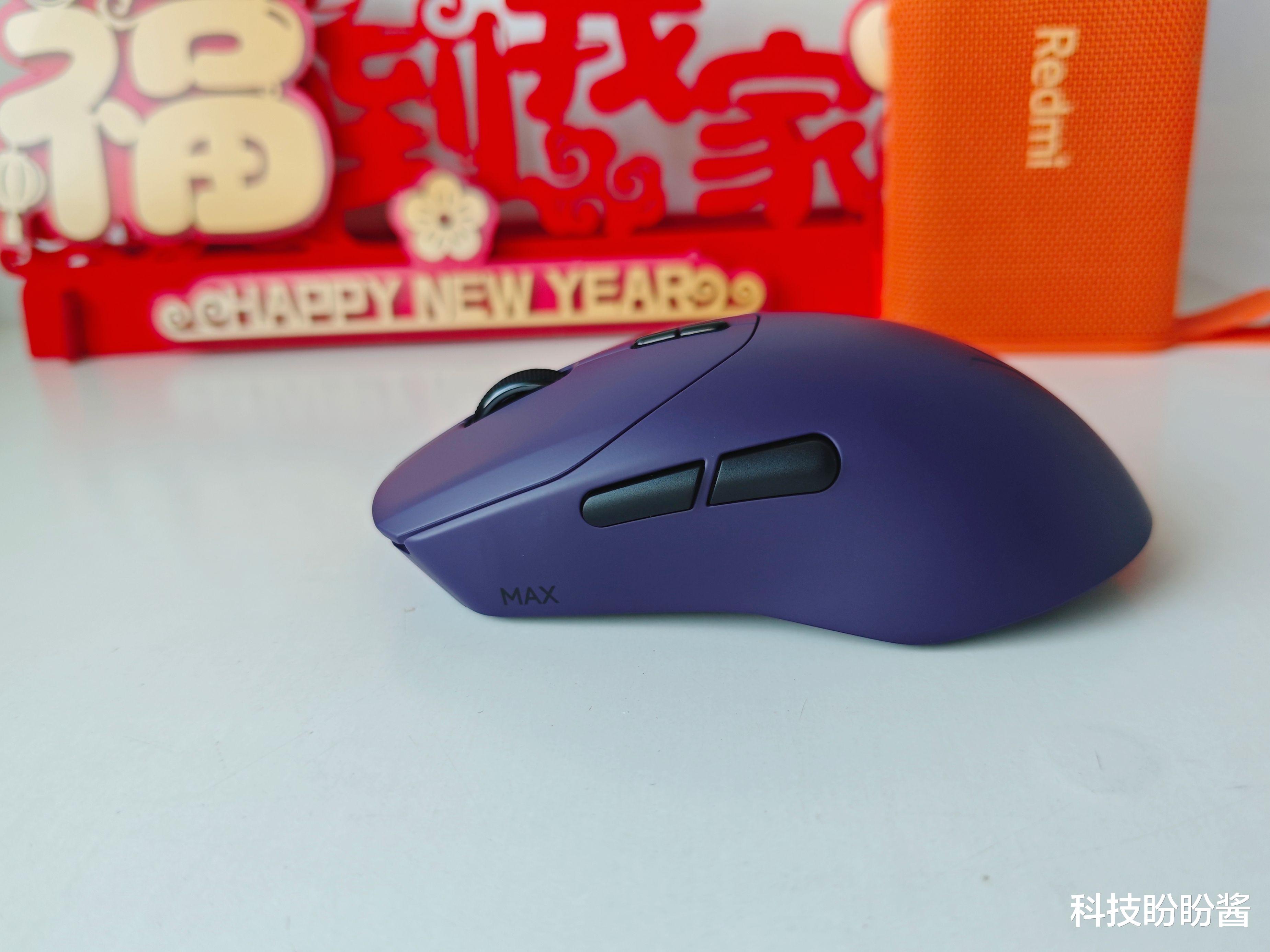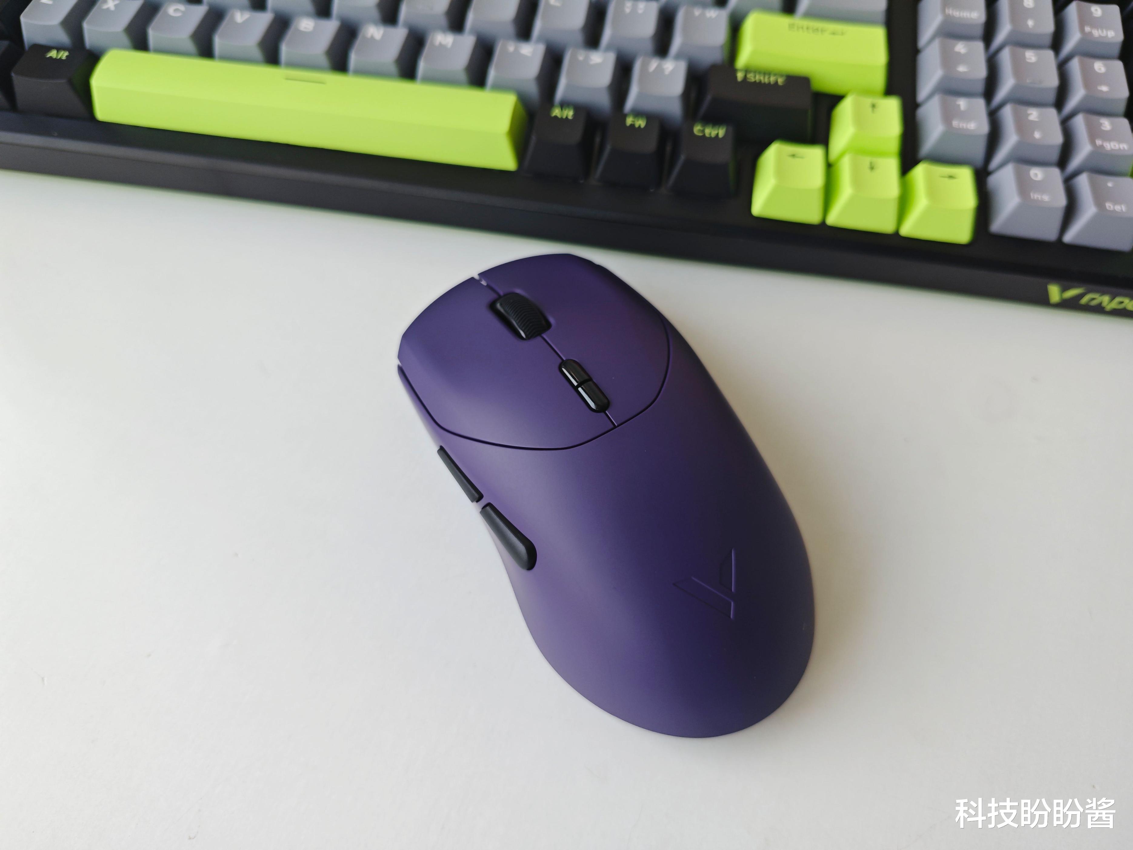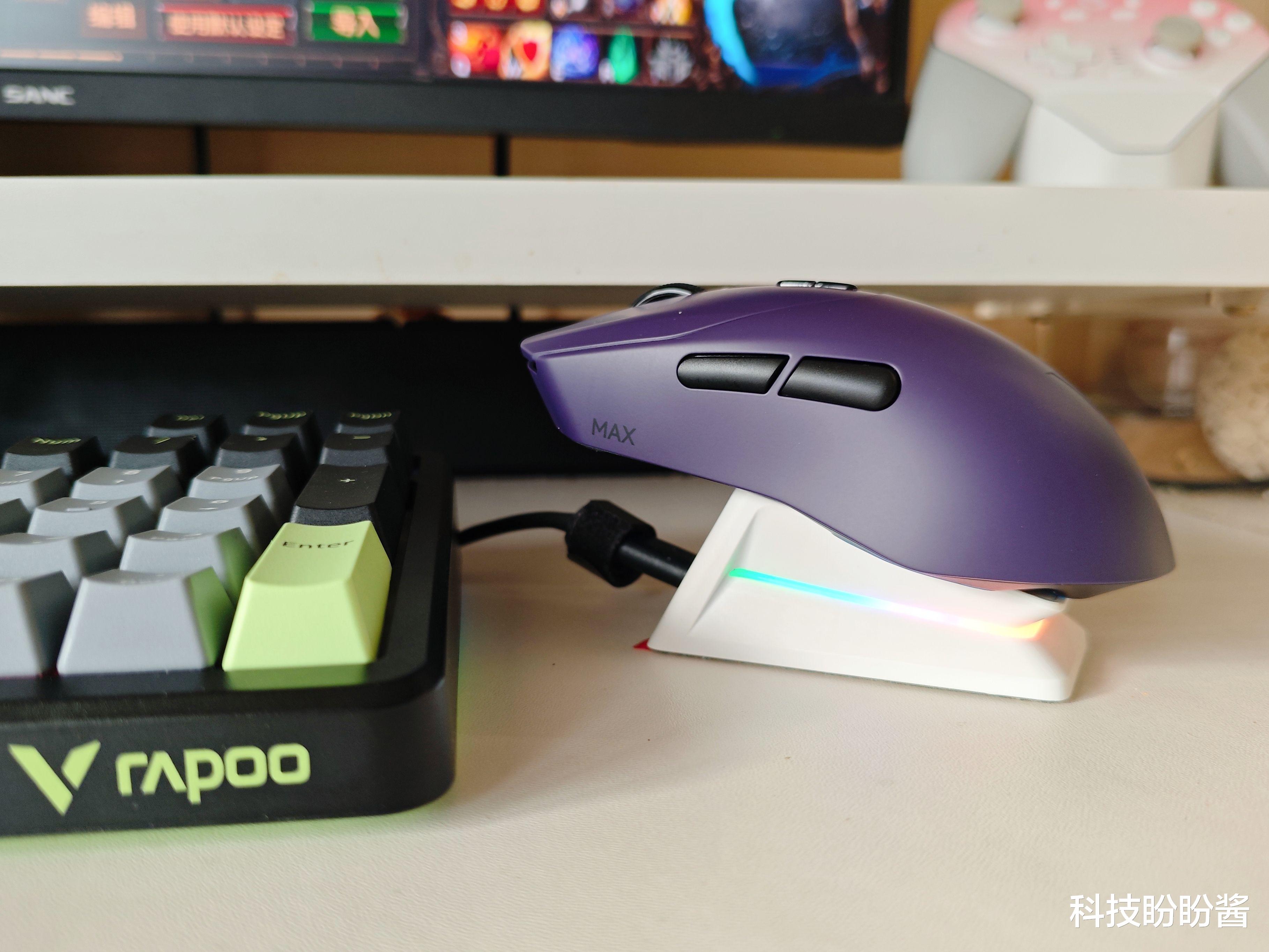 说完键盘,再聊聊这款雷柏VT9 MAX鼠标,紫色款颜值真的绝了。整体造型简洁大气,是右手对称鼠标,特别适合中大手型的用户。虽然体积不算特别小巧,但重量控制得非常好,不带接收器的情况下,重量仅约53g。长时间握持也不会觉得累。