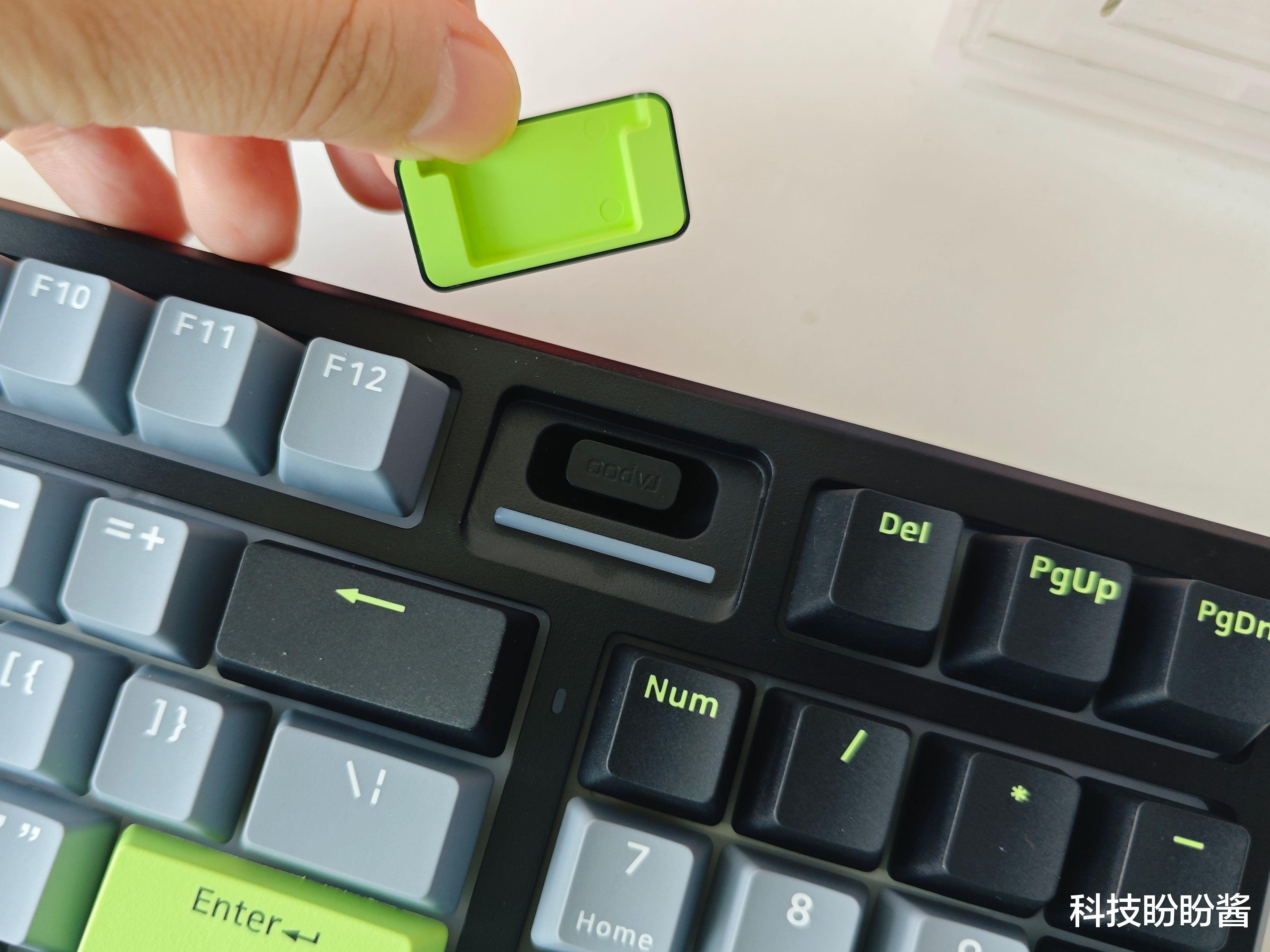 机身小巧精致,圆润的边角,视觉上很有层次感。摆在桌面上就是妥妥的颜值担当。最戳我这种细节控的,是右上角的“时空幻境仓”,一个磁吸盖板,不仅收纳着USB接收器,还藏着一个小巧的RGB灯条,而且接收器也是磁吸式的,牢牢吸附在仓内,再也不用担心随手一放就弄丢接收器的尴尬。多功能装饰灯则可以通过Fn+空格查看键盘剩余电量。