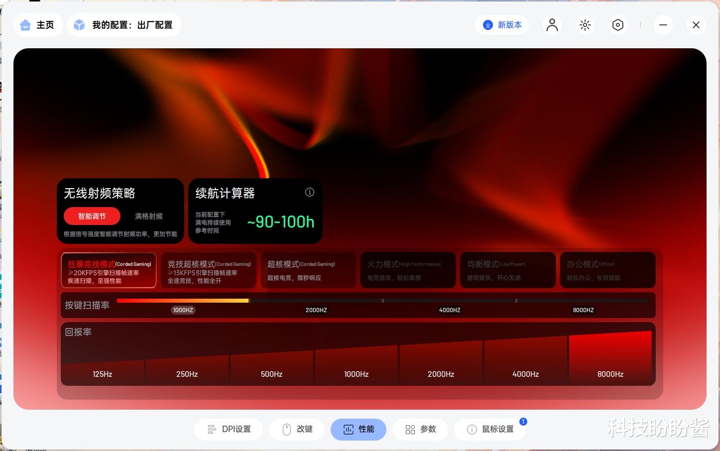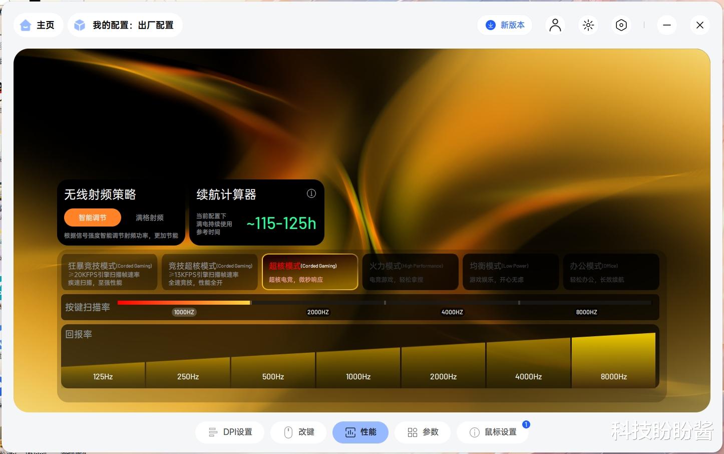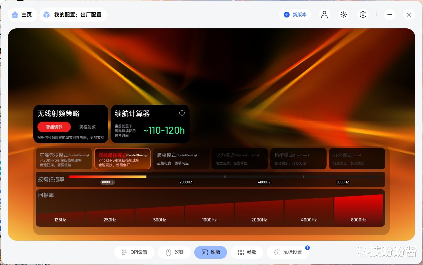 性能界面更是贴心地设置了六种模式,满足不同场景的需求:狂暴竞技模式适合职业电竞玩家,静态扫描帧速率≥20000FPS,能极致释放性能;竞技超核模式适合高强度天梯排位,帧速率≥13000FPS,兼顾性能和稳定性;还有超核模式、火力模式、均衡模式和办公模式,分别对应不同的使用场景,而且不同模式下,页面颜色还会跟着变化,细节感直接拉满。