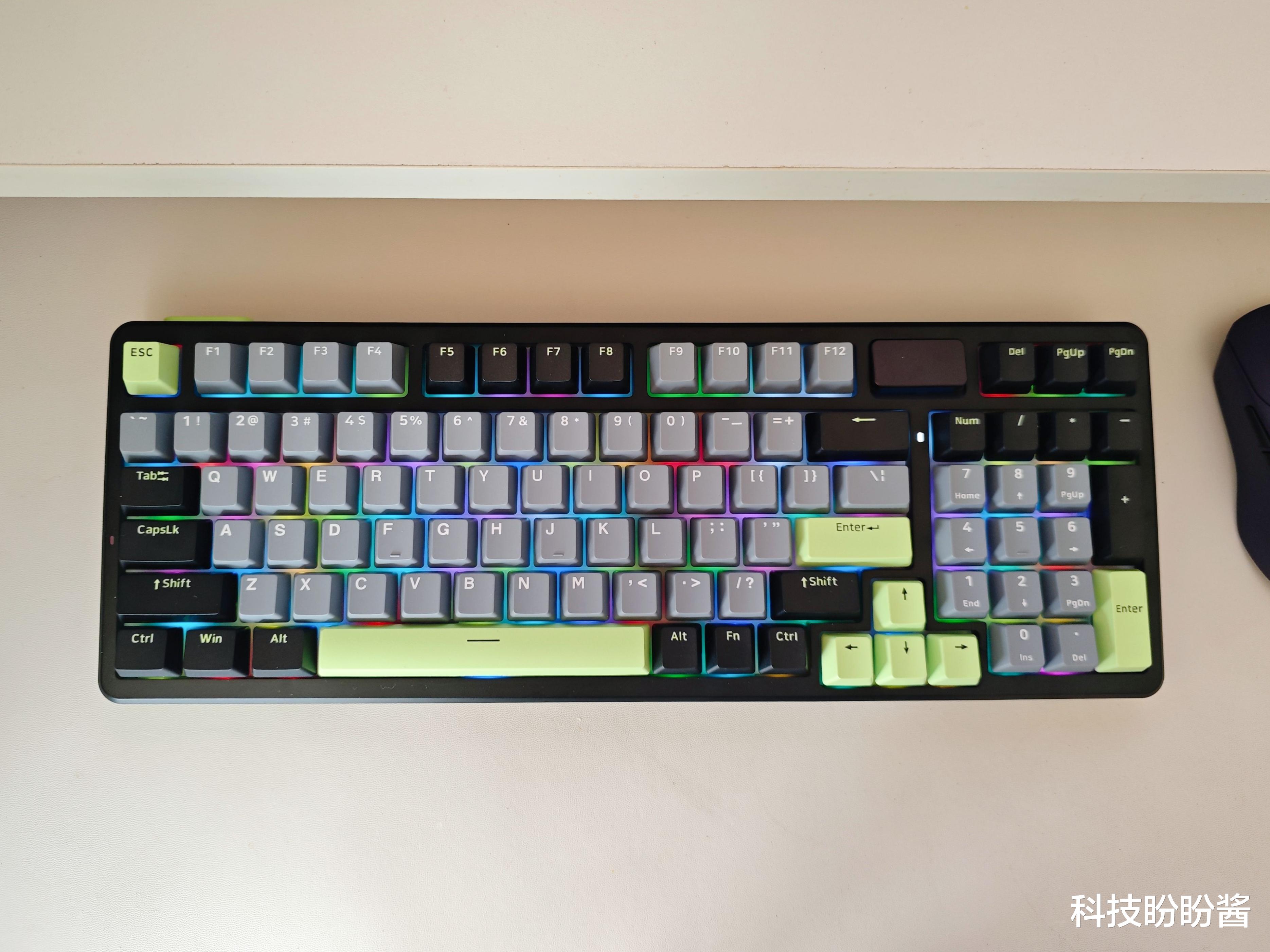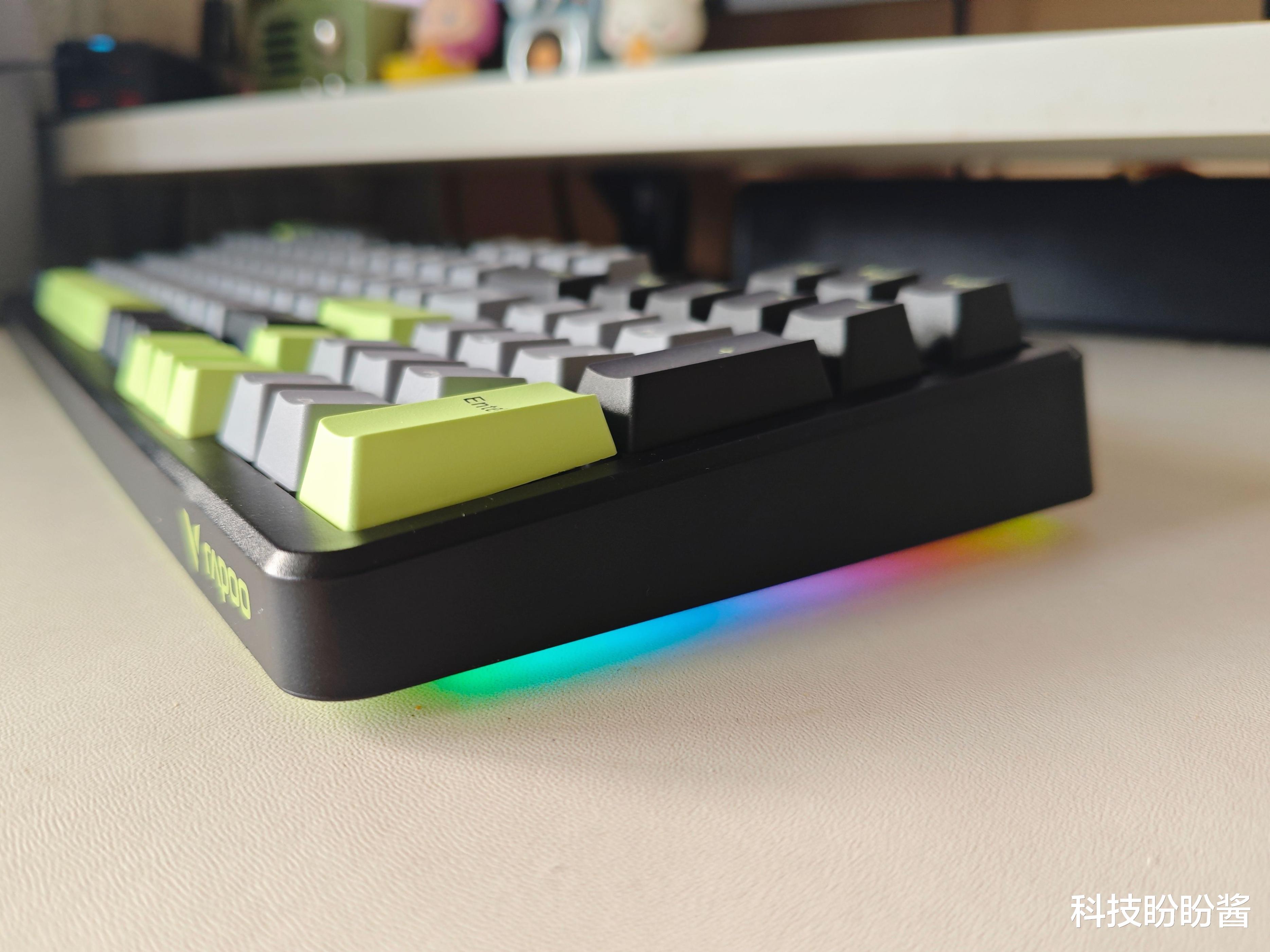 键盘左右两侧还特别设计了两条RGB灯带,点亮后氛围感十足。晚上关灯打游戏的时候,灯带柔和的光线映在桌面上,既不会刺眼影响操作,又能营造出满满的电竞感。