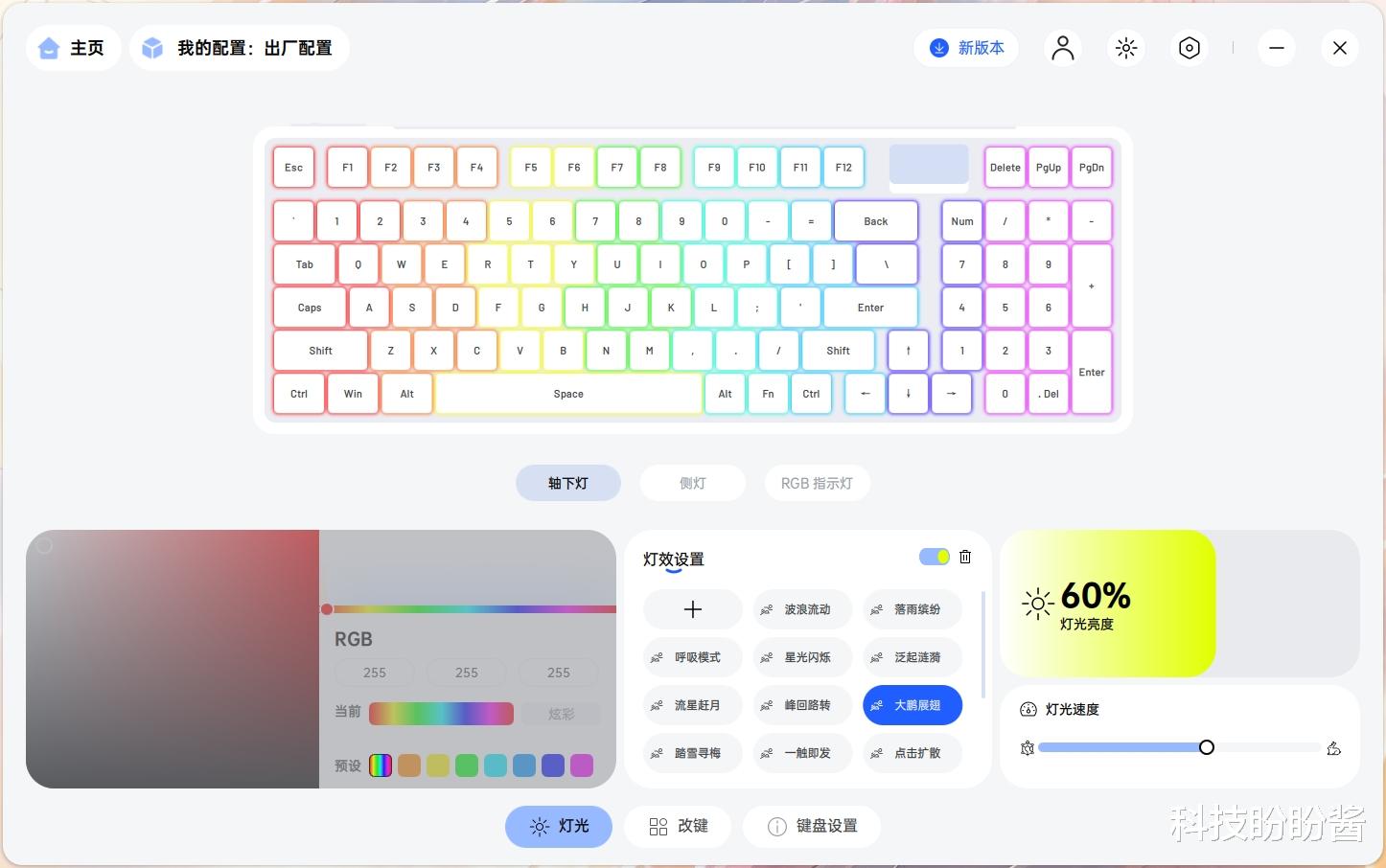 而键盘在驱动的加持下,也能实现更多个性化操作,比如1%步进亮度调节、无极速度调节、自定义灯效等,改键、键盘设置功能超级丰富,就算是新手,也能轻松上手,打造属于自己的专属键鼠。
