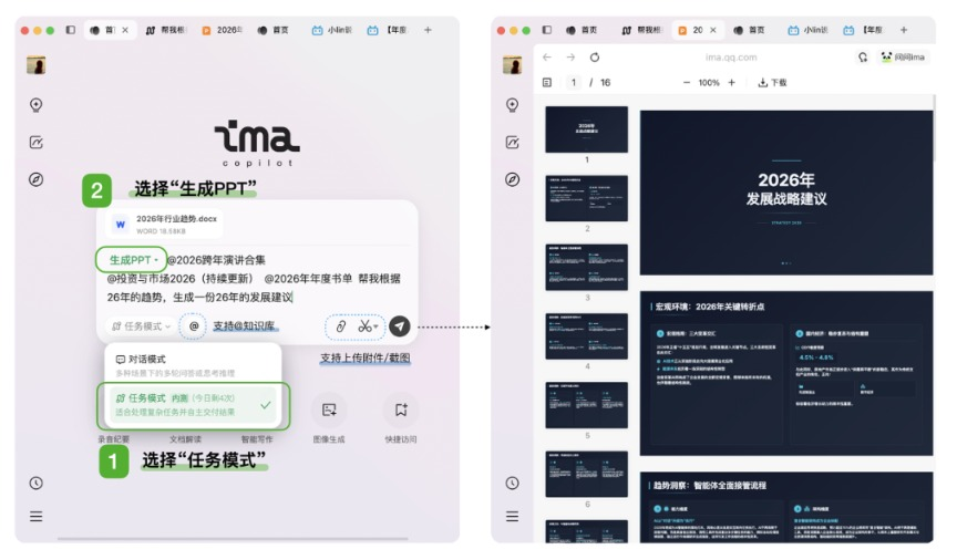 2026年1月5日,腾讯AI工作台 ima.copilot(简称 “ima”)迎来重要更新,正式上线 “生成PPT” 功能。用户进入ima的 “任务模式” 后,可直接调用个人知识库中的素材,一键生成逻辑连贯、排版专业的幻灯片。此次升级被腾讯定义为ima在多模态产出形态的关键突破,通过深度绑定用户私有知识库,让ima从 “信息处理工具” 进化为 “懂用户需求的生产力搭档”,为AI行业动态中的办公效率革新提供新方向。