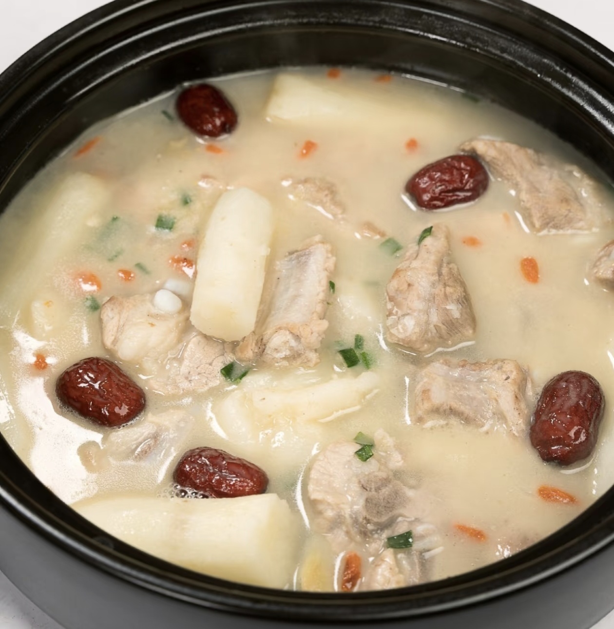 掀开砂锅盖子的瞬间,浓郁的肉香混着山药的清甜扑面而来,奶白色的汤汁里,排骨软烂脱骨,山药绵密入味,红枣饱满香甜,枸杞点缀其间,光是看着就让人垂涎欲滴。舀一勺汤喝进嘴里,鲜醇的滋味在舌尖化开,暖乎乎的汤汁滑进胃里,整个人都跟着舒展起来。山药健脾养胃,红枣补中益气,排骨补充营养,这碗汤不仅好喝,更是满满的滋补,不管是老人还是孩子,都能放心享用。