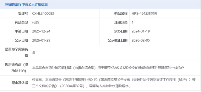 2026年1月29日,国家药品监督管理局药品审评中心公示,恒瑞医药申请的HRS-4642注射液拟纳入突破性治疗品种,用于携带KRAS G12D突变的晚期或转移性胰腺癌的一线治疗。