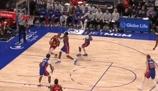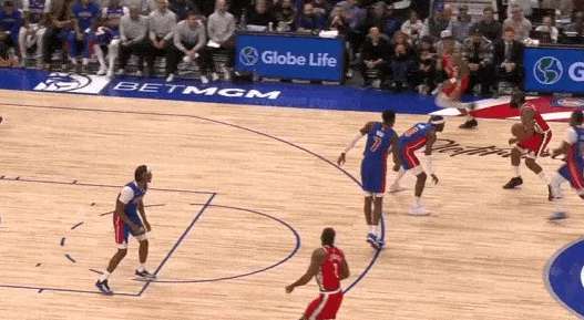 接哈登心领神会的击地球领人,空中躲过起跳护框的里德双手扣篮得手。