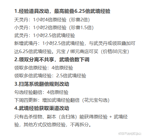 与无敌丹改动一并上线的还有武境的扫荡经验翻倍选项,这是之前就有预告的,之前改动后是暂时只能勾选普通经验的4倍,现在是多了花元宝拿2.5倍或6.25倍的武境经验的选项。
