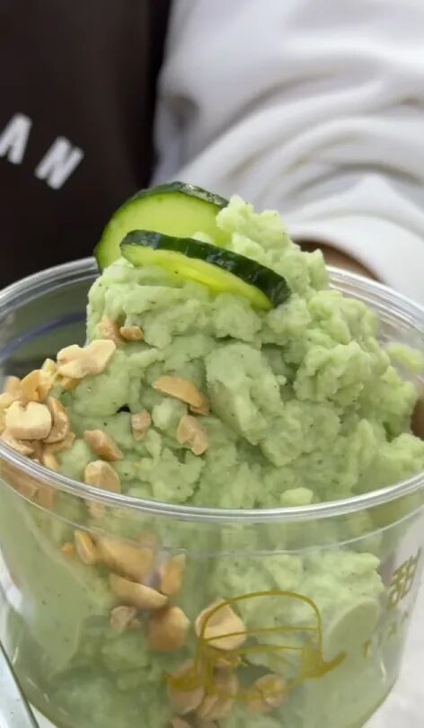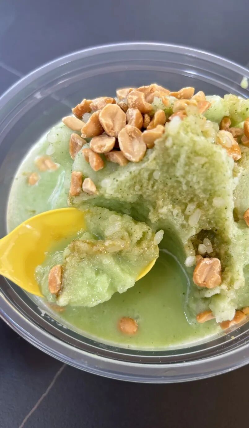 小清新的绿色,虽说一看就有点“冷”,但还是很勾人食欲。站在太阳底下,一勺接一勺的冰浆送入口中,黄瓜的清新、牛奶的香甜和糯米的绵密层层递进,相互交融,最后化作一到冷雾飘出。这一刻,冬天吃冰的“叛逆”得以圆满!