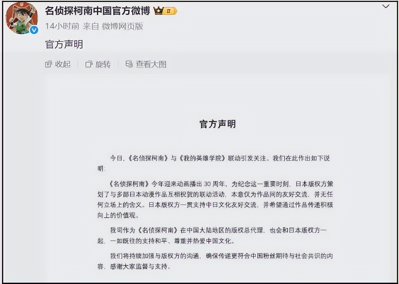 更气人的是官方的回应。1 月 31 号晚上,柯南中国版权方上海新创华发了个声明,通篇读下来没看见一个 “对不起”,满屏都是甩锅:“是日本版权方策划的”“就是作品间友好交流”“没有立场问题”,最后还不忘加一句 “支持中日文化友好”。