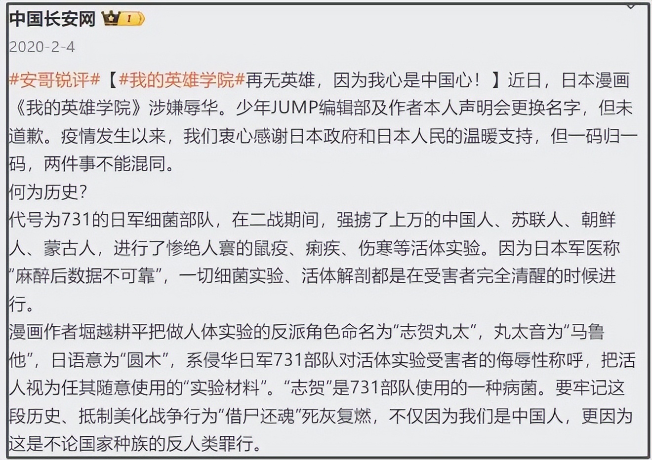 可能有人没印象了,我再帮大家回忆下:《我的英雄学院》第 259 话里,有个搞人体实验的反派叫 “志贺丸太”。“丸太” 在日语里念 “马鲁他”,这可不是普通名字,是当年侵华日军 731 部队对活体实验受害者的侮辱性称呼!那些被当成 “实验材料” 的中国人、朝鲜人,在日军嘴里就是 “马鲁他”;而 “志贺” 更恶心,取自发明痢疾杆菌的日本细菌学家志贺洁,731 部队当年就用这种病菌害了无数人。