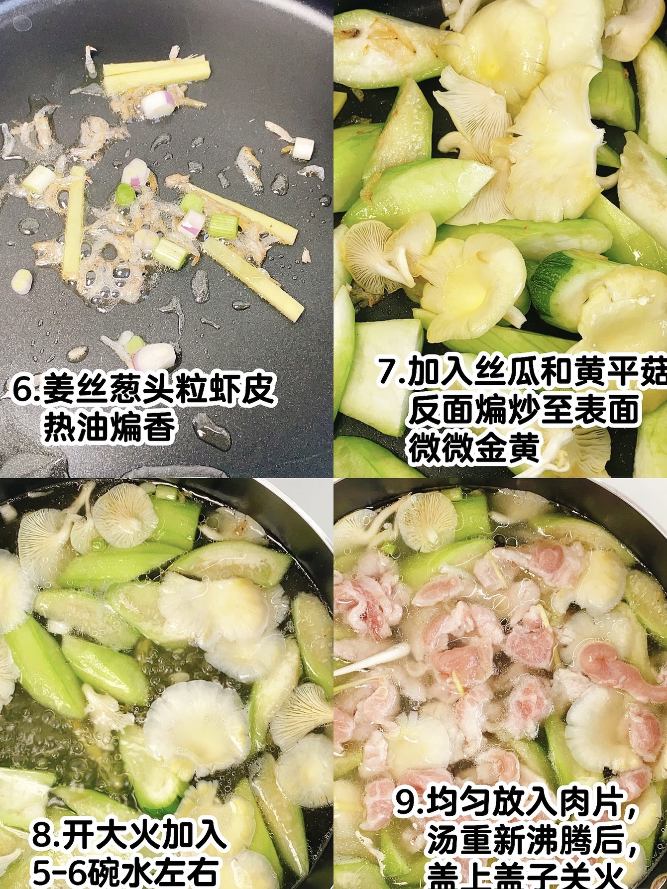 现在,所有的准备工作都做好了,可以开始烹饪了。在锅中加入适量的油,放入姜丝、葱头和虾皮,用中小火慢慢煸香。当香味四溢时,加入丝瓜和平菇,翻炒均匀,直到表面微微金黄。