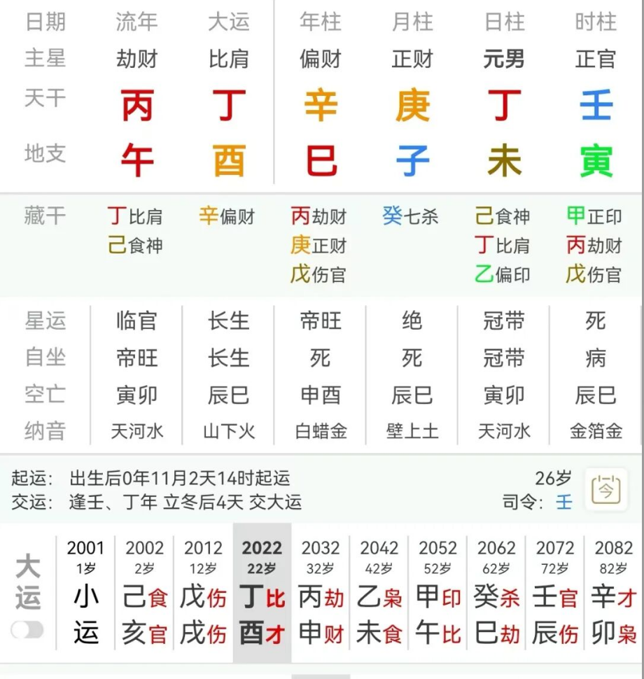 但是庚在月柱,寅在时柱,这个劈甲的作用就不是很理性,也代表自己的学业问题不是拔尖,需要未土,巳火来支撑丁火的燃烧。