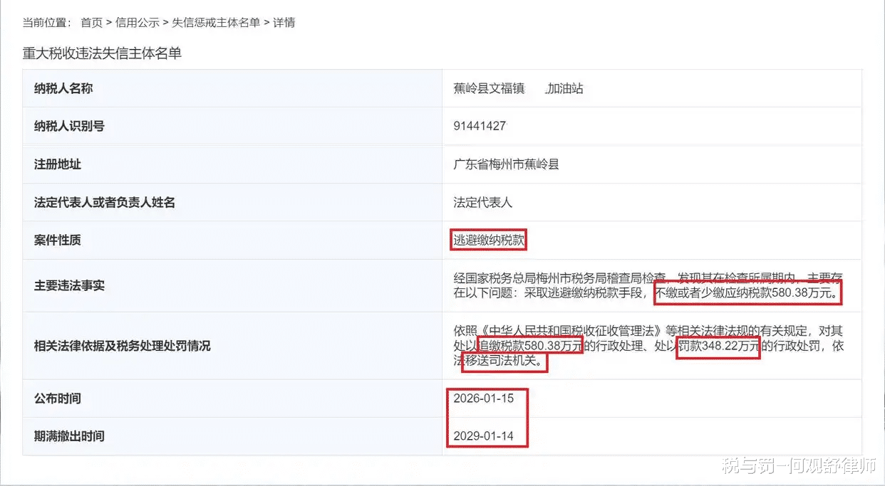 2026年1月15日,信用广东公布了一批重大税收违法失信主体名单。其中,有6家加油站因逃避缴纳税款被确定为重大税收违法失信主体,所辖税务部门对6家加油站分别处以追缴税款、罚款的行政处理处罚,或因涉嫌逃税罪依法移送公安机关立案侦查。