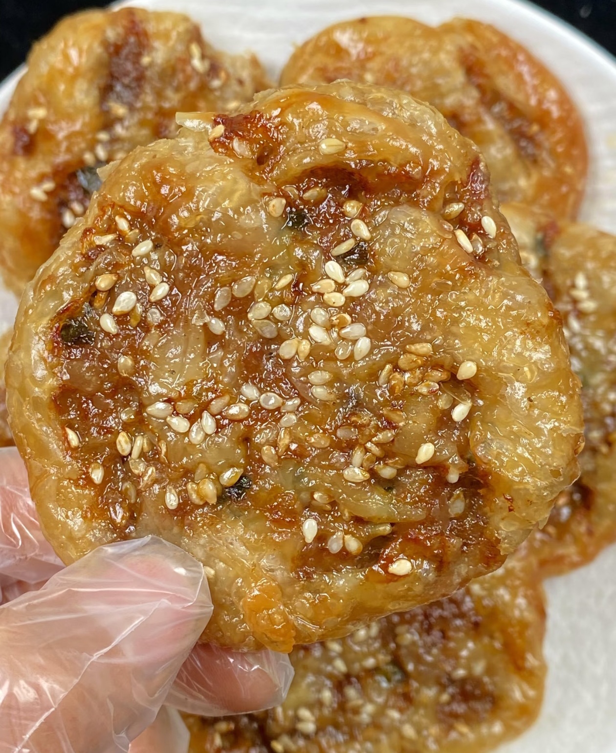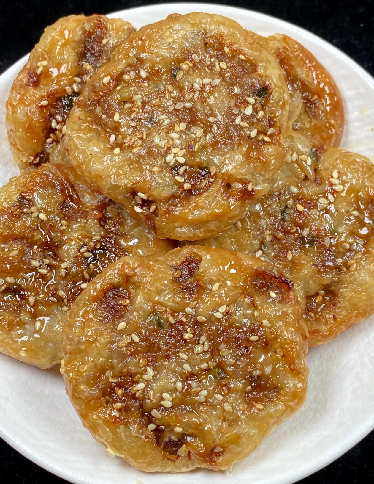 把包好的小团子放在铺了油纸的烤盘上,用手掌轻轻把它压扁,压成一个个薄薄的圆饼,表面再撒上一层白芝麻点缀,这样烤出来会更香更好看。接下来就轮到空气炸锅登场了,把压好的饼胚放进空气炸锅里,温度设置成180度,时间先定10分钟,等时间到了之后,把饼胚翻个面,再继续烤10分钟,整个过程一共20分钟,中途翻面能让两面都烤得金黄酥脆,不会出现夹生的情况。
