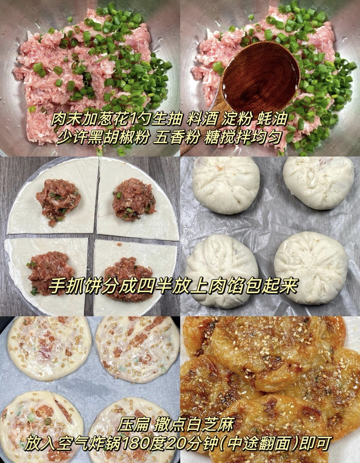 先准备好食材,手抓饼是灵魂,再配上肥瘦相间的猪肉末,还有葱花、生抽、料酒、淀粉、蚝油、黑胡椒粉、五香粉和一点点糖。把猪肉末放进大碗里,抓一把切碎的葱花撒进去,接着依次加入1勺生抽、1勺料酒、1勺淀粉、1勺蚝油,再撒上少许黑胡椒粉、五香粉和一小勺糖,用筷子朝着一个方向使劲搅拌,直到肉馅变得黏黏糊糊、上劲为止,这样吃起来口感才会紧实又多汁。