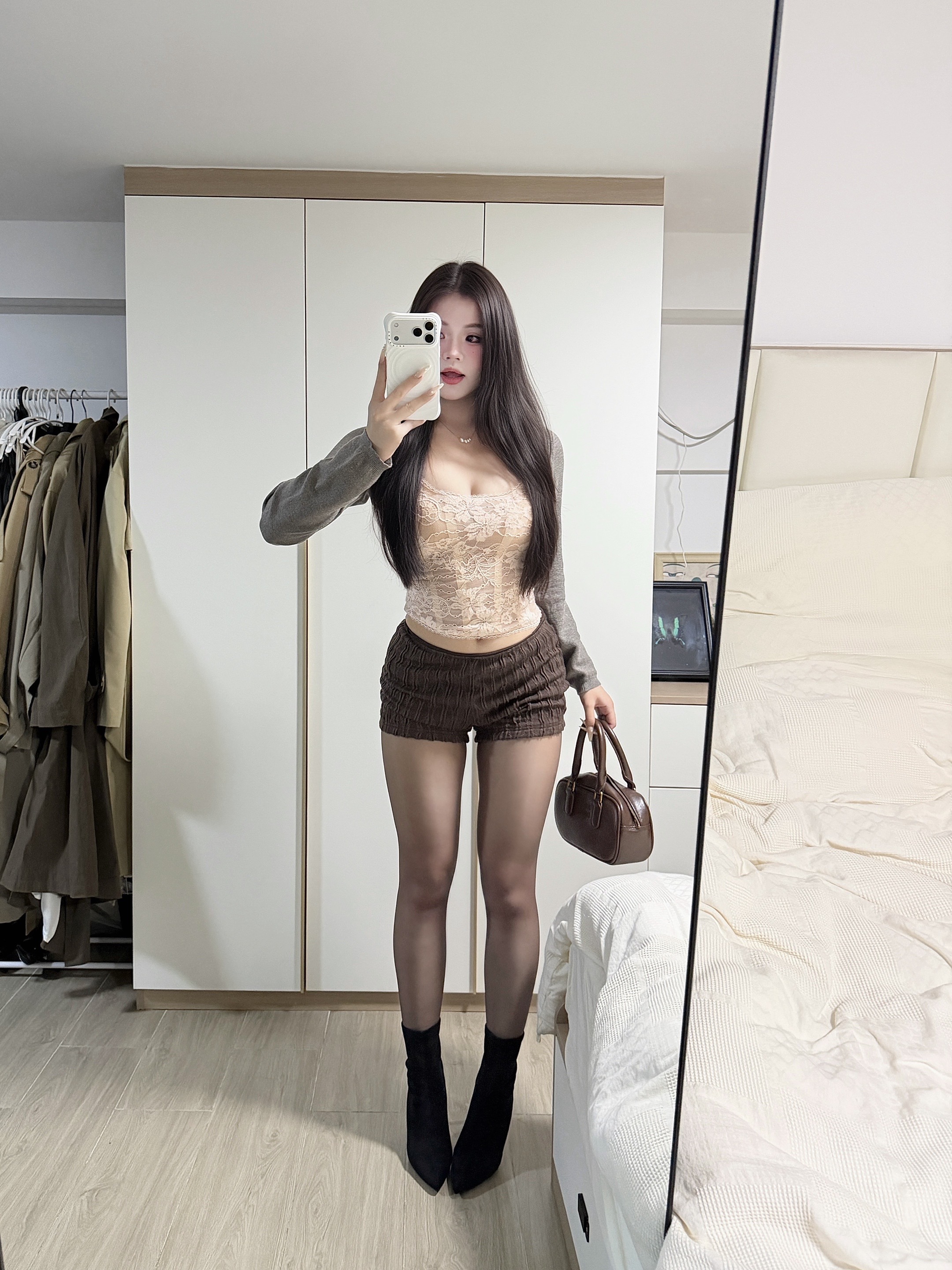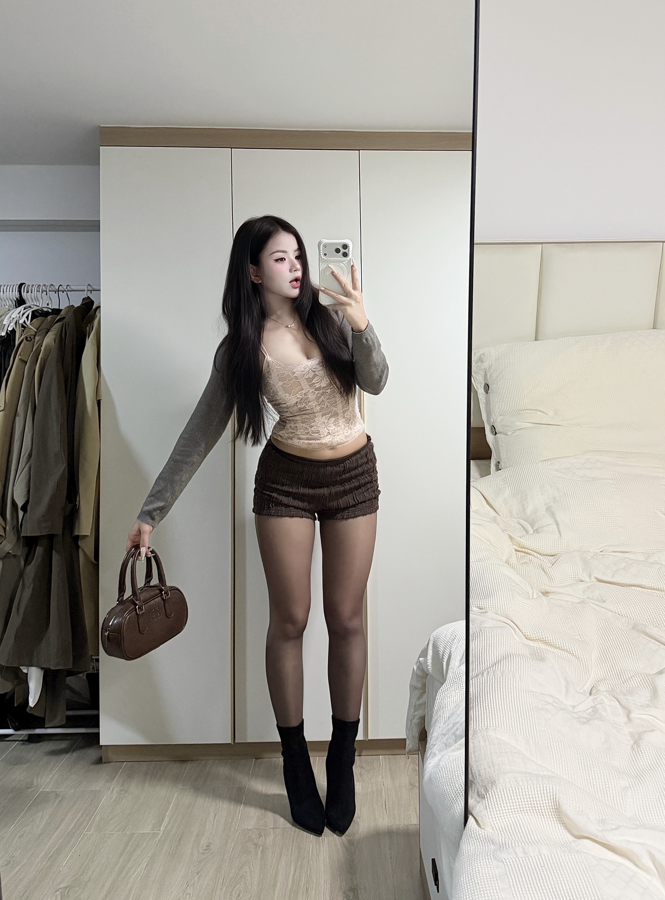 浅灰色针织开衫内搭米白蕾丝吊带,下身配棕色短裤与黑色丝袜。整体配色温柔和谐,蕾丝细节增添精致女人味,是典型的温柔知性轻熟风,适合日常通勤与约会。