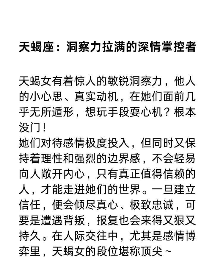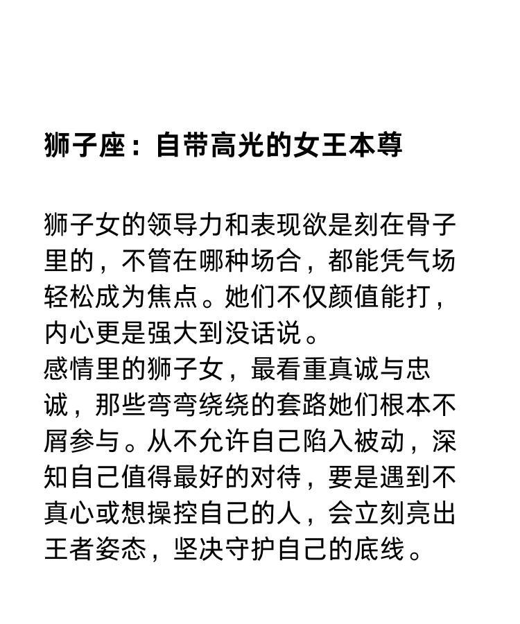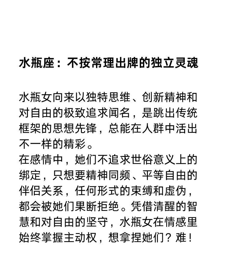 归根结底,狮子座、水瓶座、天蝎座女性并非生而无敌,她们会跌跤、会迟疑,也有人误读她们的强硬。但她们用各自的方式在博弈中实现自我,哪怕只是在不动声色间维护属于自己的规则。未来,星座也许会被赋予更多个人标签,但坚定自持、自由思考和深刻洞察,始终是她们赢得尊重的武器。